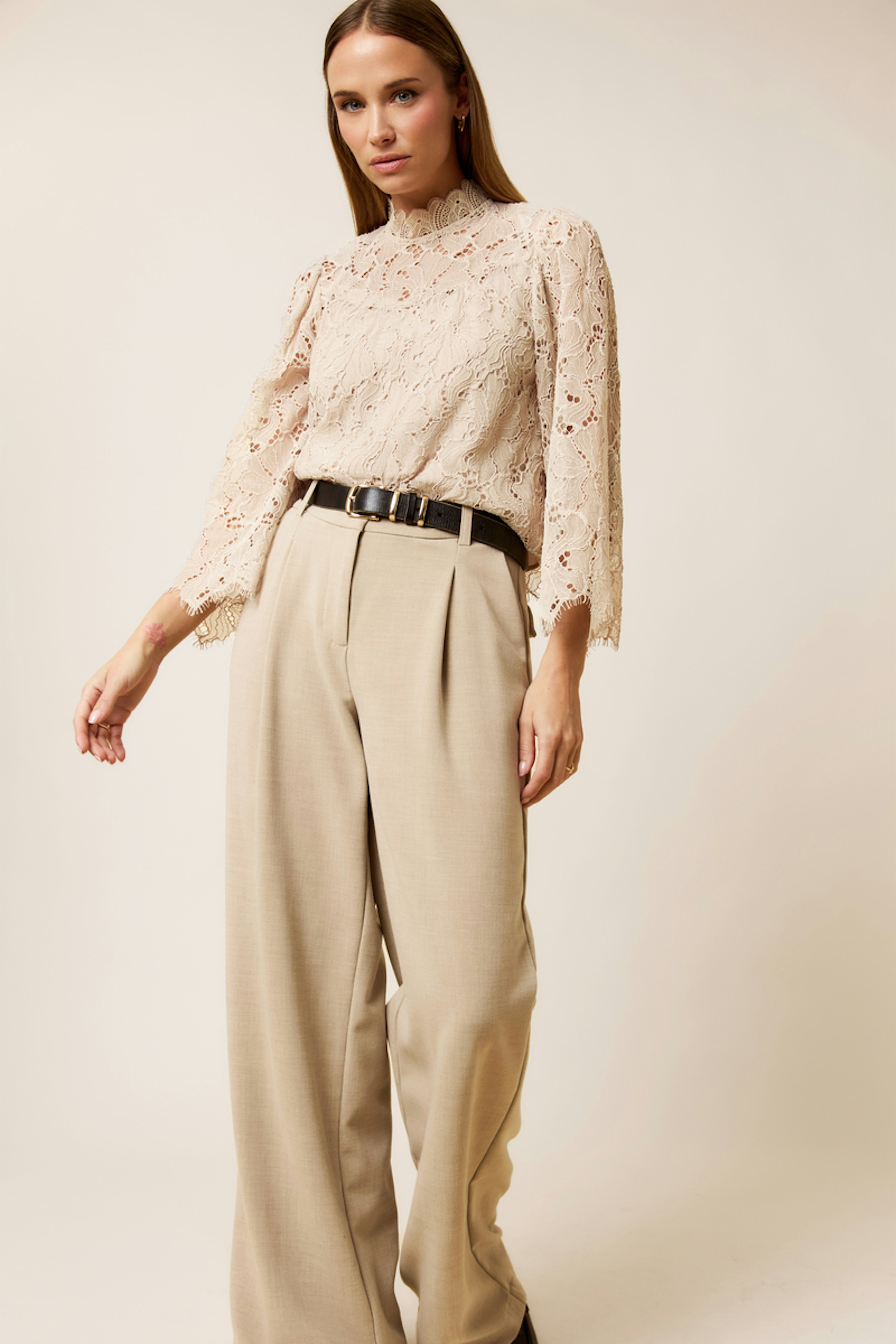 Wear this romantic blouse with high-waisted jeans and ankle boots for an elegant yet casual look, perfect for any season.<br/><br/>• Lace blouse<br/>• High collar<br/>• 3/4 sleeves<br/>• Cut-out details<br/>• Scalloped finishes