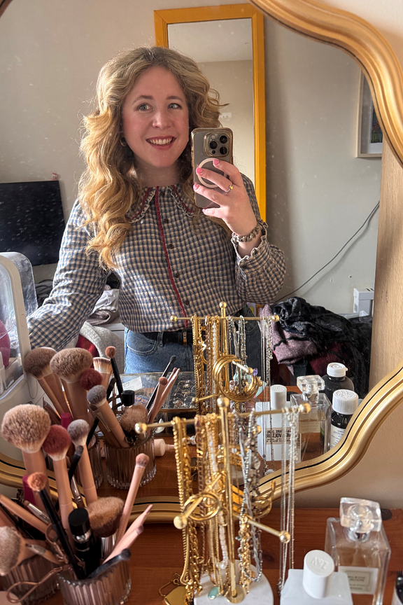 This blouse pairs perfectly with beige pants and ankle boots for a chic winter look. Don’t forget to add a wool coat for an elegant touch. • Long-sleeved shirt • Ruffled Peter Pan collar • Button closure • Checked pattern • Contrast details with red piping