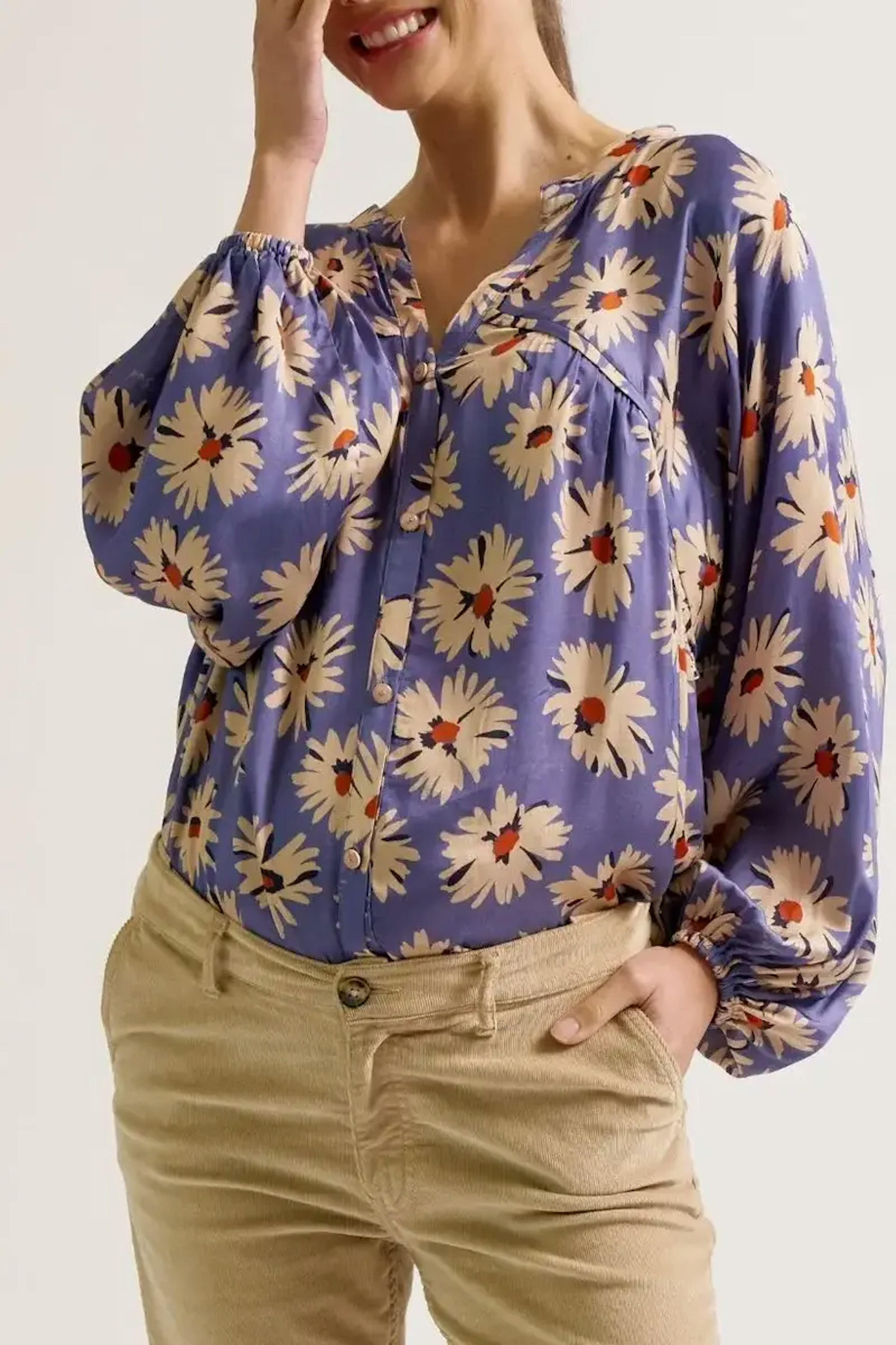 Pair this cozy blouse with chic pants and leather boots for a refined winter look. • Viscose blouse • Floral print • Long puff sleeves • V-neckline • Perfect for Maternity