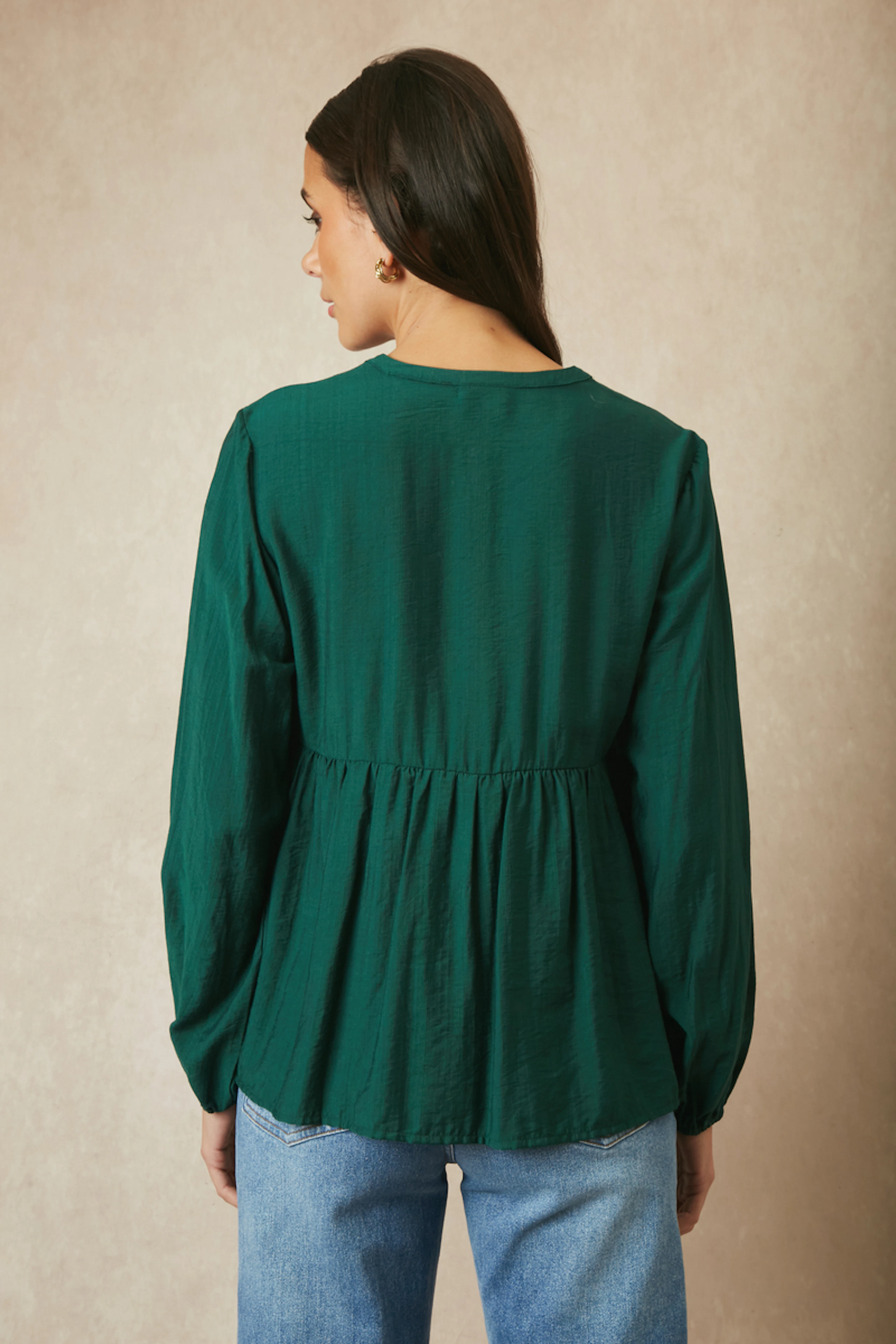 For a chic and comfortable look, pair this blouse with skinny jeans and leather ankle boots. In winter, add an oversized cardigan for more warmth. Perfect for the cold season. • Viscose blouse • Mao collar • Long sleeves • Balloon sleeves • Elasticated waist The awareness label indicates and ensures that the product contains preferred materials such as organic cotton, recycled polyester, Lenzing™, EcoVero™, modal, viscose, and Tencel™.