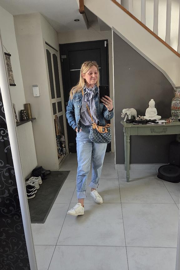 Style this blouse with high-waisted pants for a chic and modern look, perfect for winter. • Cotton blouse • Loose fit • Puff sleeves • Bow tie collar • Striped pattern