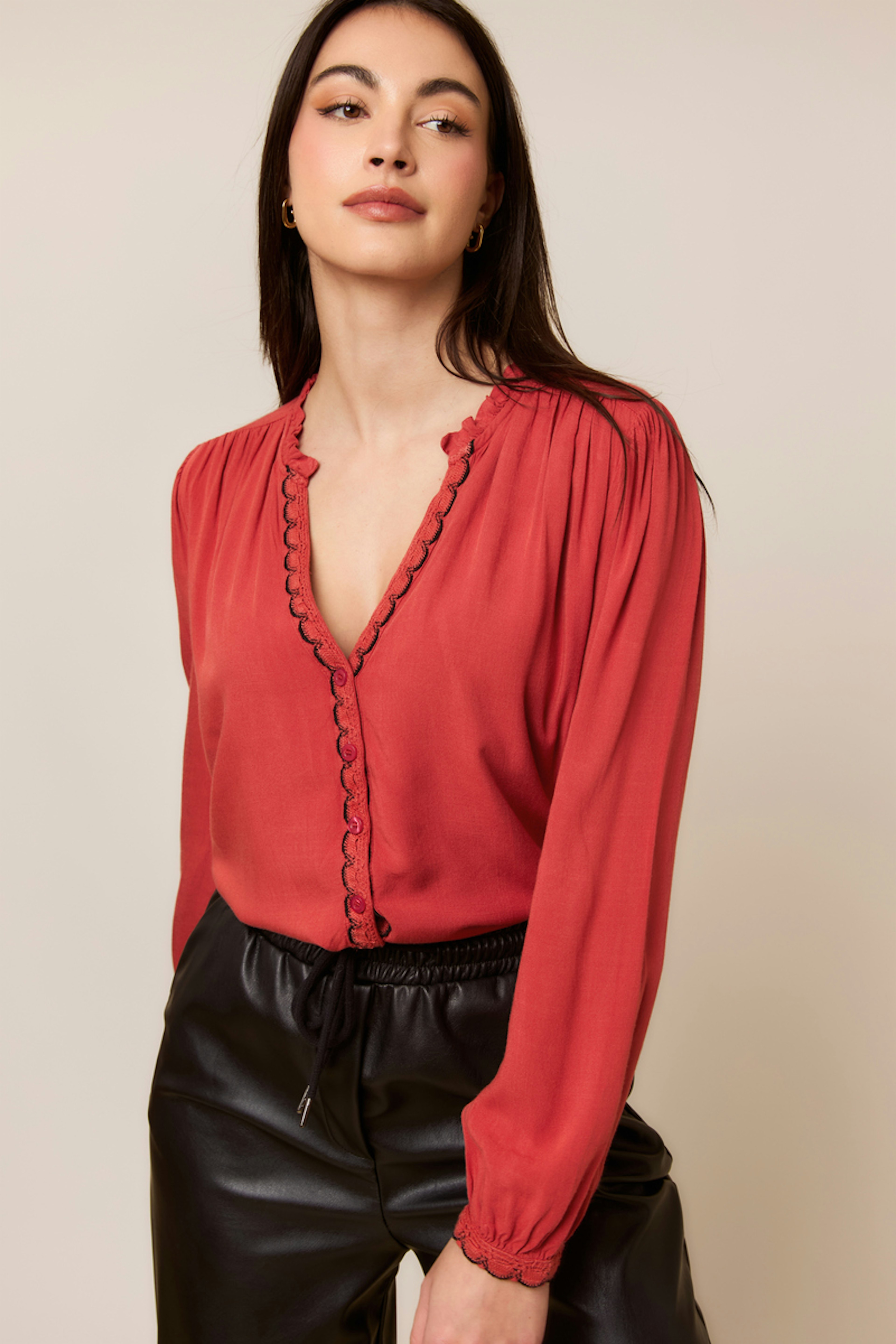 This blouse pairs wonderfully with raw jeans and black ankle boots for a chic look all winter long. • Long-sleeved blouse • Straight cut • Gathered shoulders • Decorative buttons • Contrasting embroidery details