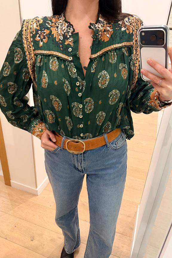 Opt for this vibrant blouse with fitted black pants and ankle boots. Perfect to brighten up those winter days. • Printed blouse • Loose and comfy fit • Long puff sleeves • Central button closure • Ornate floral details