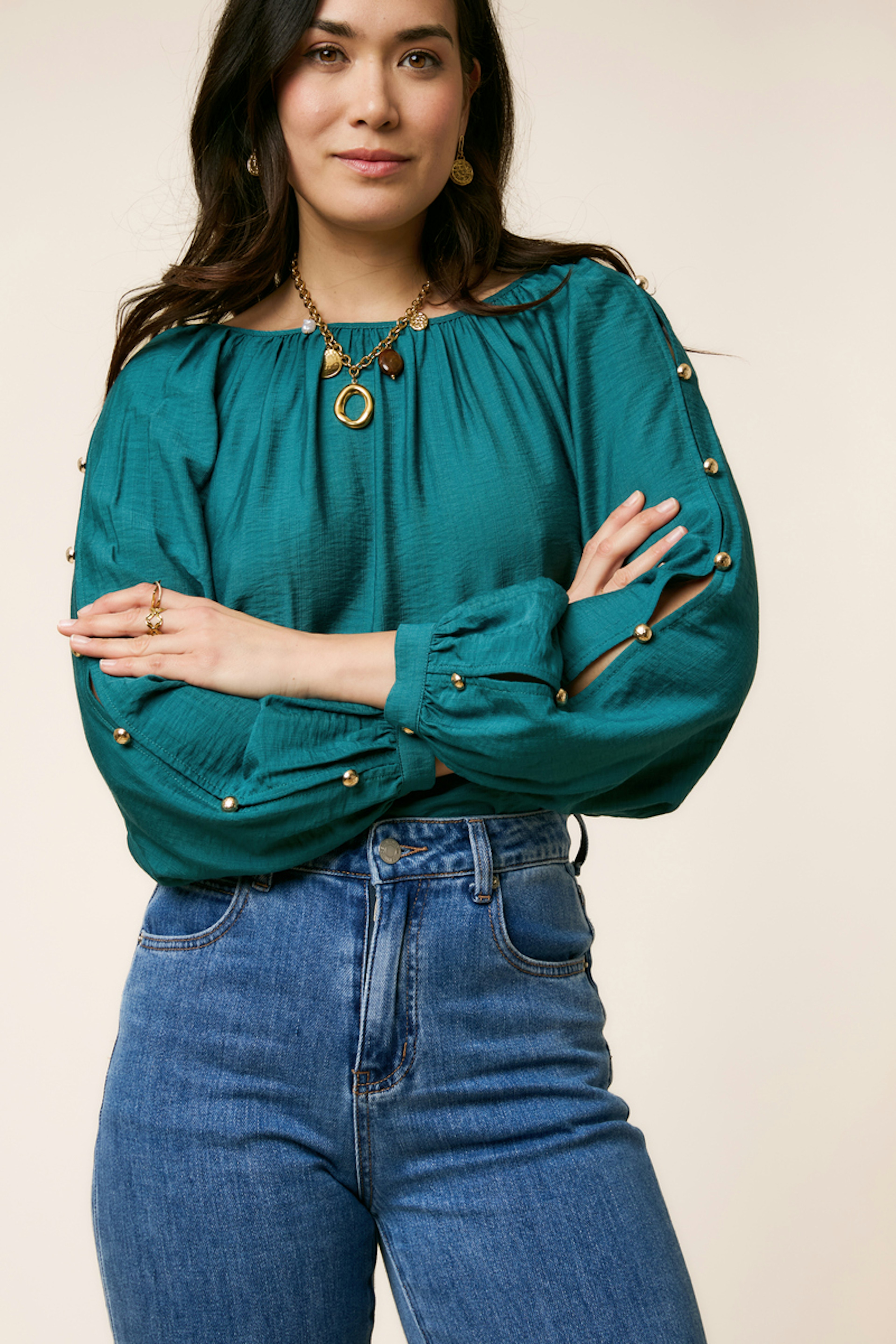 Style this green blouse with high-waisted jeans for a chic and relaxed look, ideal for winter days. • Loose blouse • Puff long sleeves • Decorative buttons • Rounded neckline • Flowing texture