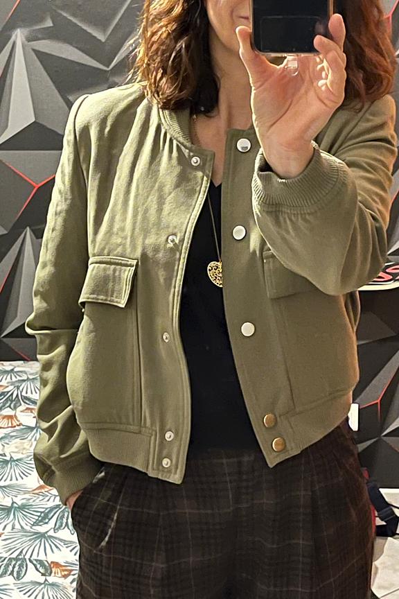 Pair this khaki jacket with fitted black jeans and elegant ankle boots for a modern look. Ideal for all seasons!<br><br>• Long sleeve jacket<br>• Straight cut<br>• Snap button closure<br>• Flap pockets<br>• Ribbed finish