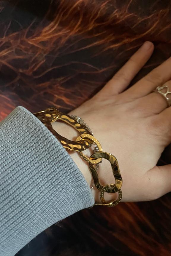 Add a touch of elegance to all your looks by pairing this bracelet with an oversized sweater or an elegant dress. • Stainless steel bracelet • Refined gold design • Wide link chain • Secure closure • Sophisticated hammered pattern