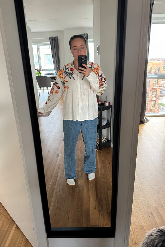 Team this shirt with vibrant embroidery with tapered pants or a denim skirt. Perfect for brightening up your summer with a refreshing touch.\n\n• White cotton shirt\n• Long sleeves\n• Shirt collar\n• Floral embroidery\n• Discreet buttons