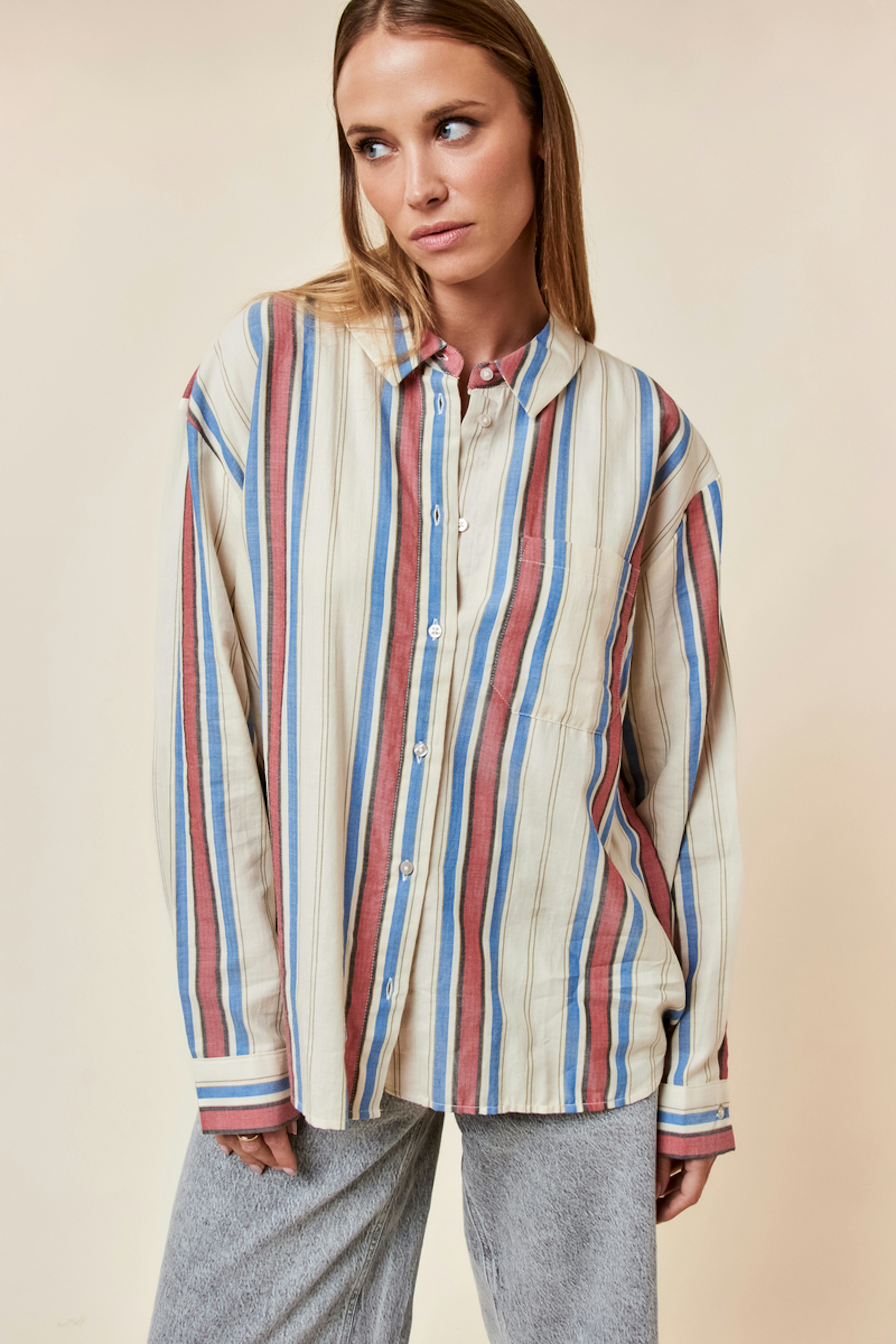 Pair this striped shirt with high-waisted jeans and ankle boots for a chic and laid-back look, perfect for winter days. • Cotton shirt • Classic collar • Long sleeves • Front buttoning • Striped pattern