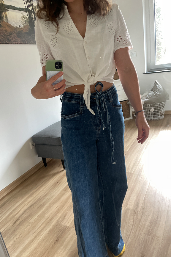 Pair this blouse with high-waisted jeans and sandals for a fresh summer style. • Cotton blouse • Short sleeves • Front knot • Shirt collar • Floral embroidery