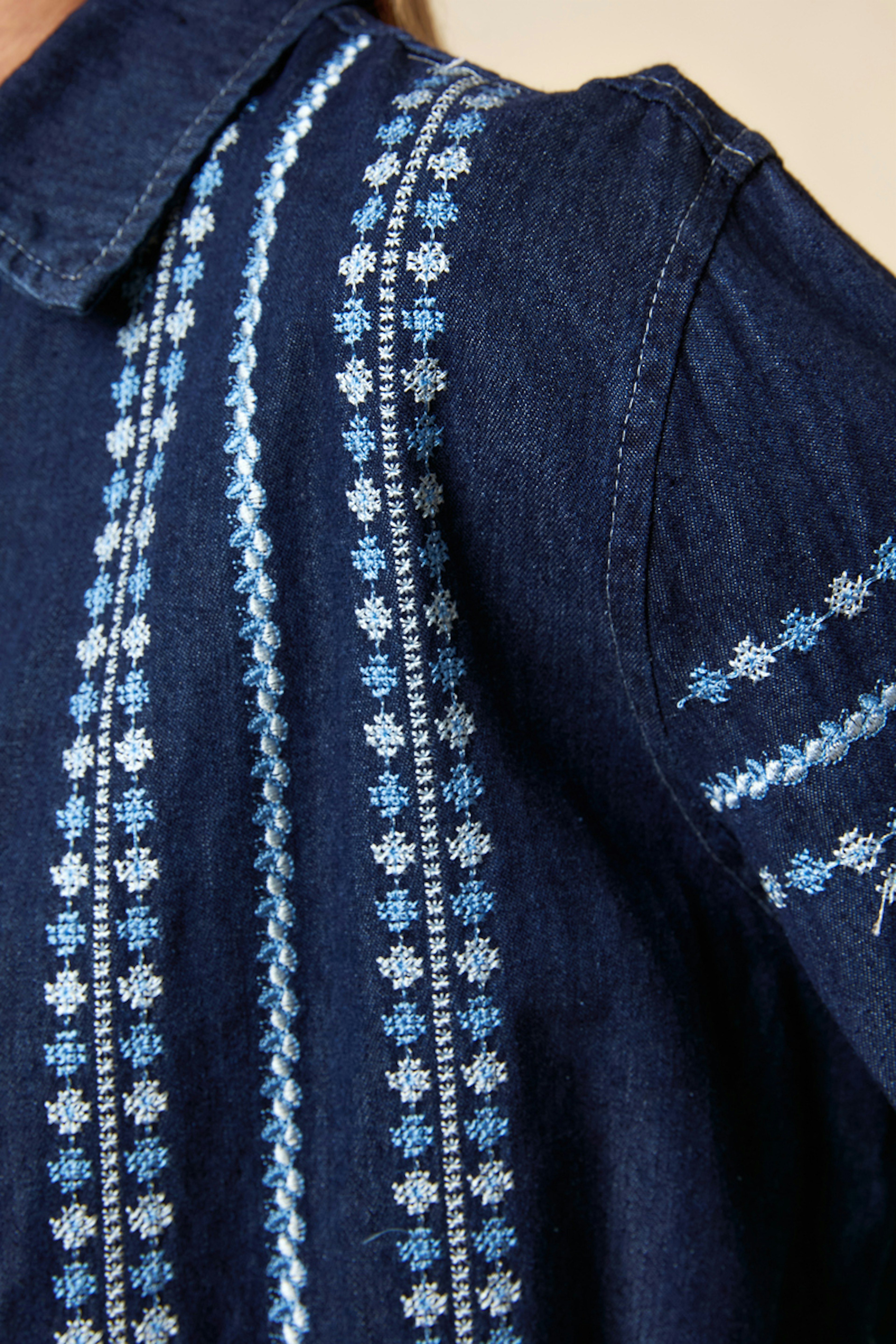 Wear this indigo shirt with white jeans and chic ankle boots for a modern winter look. • Long-sleeve shirt • Loose and comfortable cut • Classic shirt collar • Snap-button closure • Vertical blue printed pattern