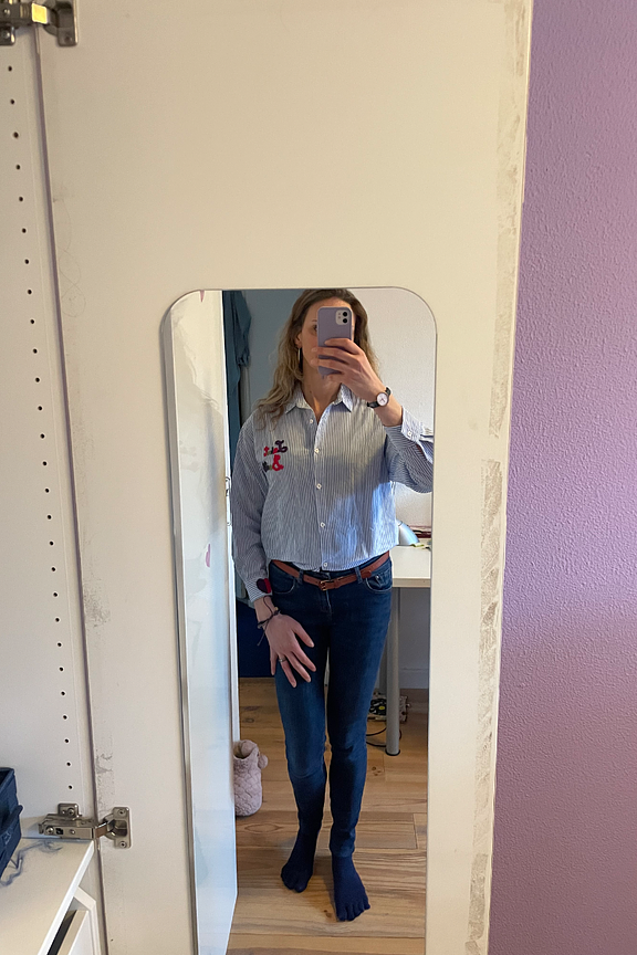 Wear this shirt with linen pants for a stylish yet casual touch, perfect for any season. • Cotton shirt • Moderate cut • Shirt collar • Long sleeves • Striped pattern with embroidered lettering