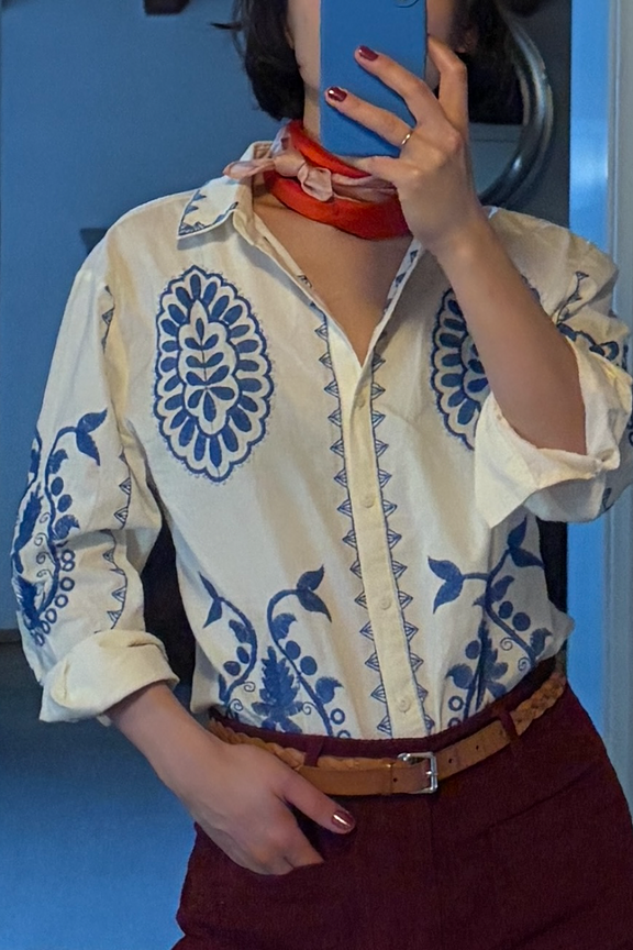“Lovely embroidery, crisp shirt, great effect! Needed to wear a long sleeve underneath as the embroidery is a little bit scratchy on a bare skin. Oversize look, really loved it!”