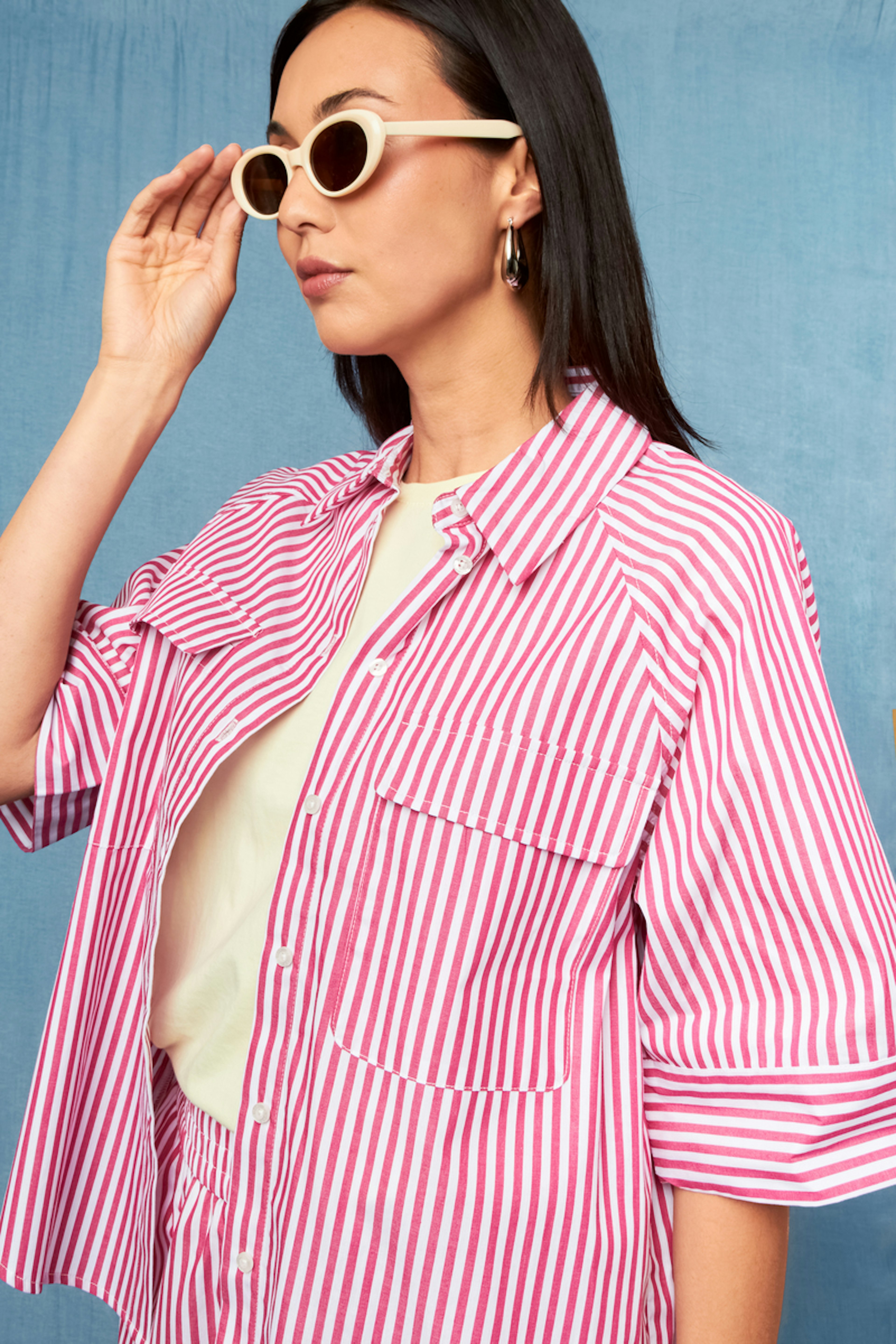 Pair this shirt with white sneakers and denim shorts for a relaxed summer look. • Cotton shirt • Mid-length sleeves • Shirt collar • Curved hem • Red stripes