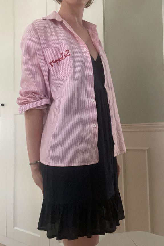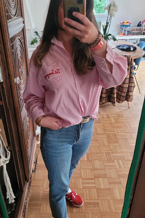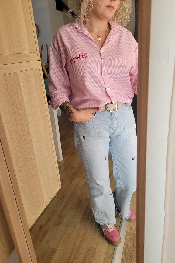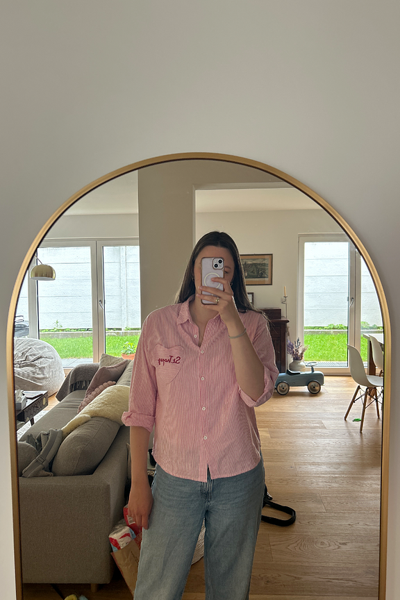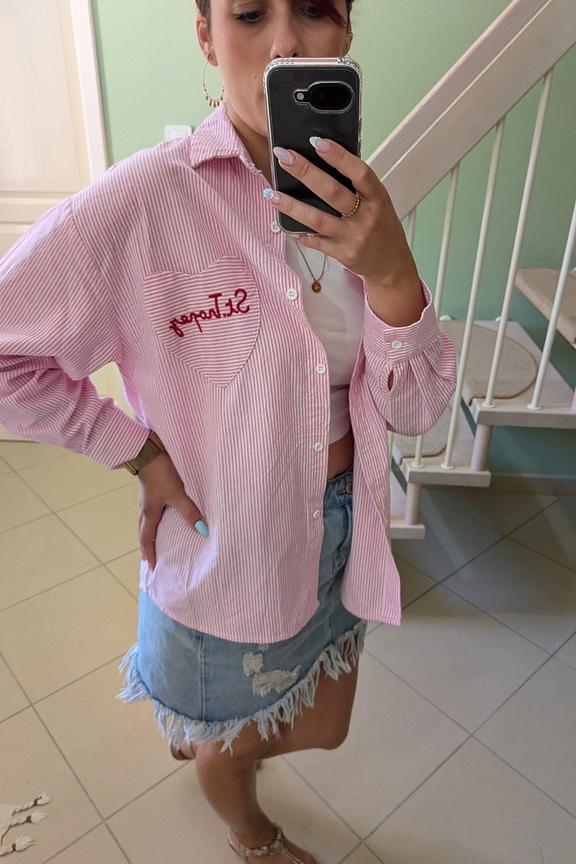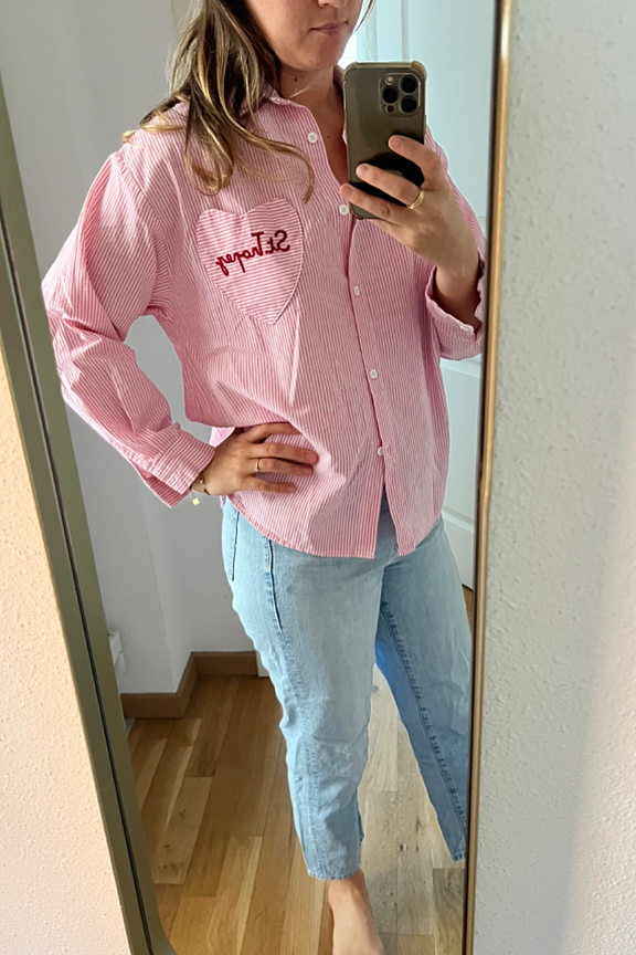 Wear it with denim shorts and sandals for a casual and relaxed summer look. • Striped shirt • Classic collar • Long sleeves • Embroidered heart pocket • 100% cotton