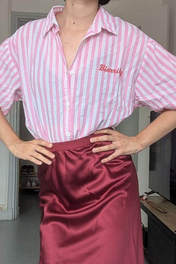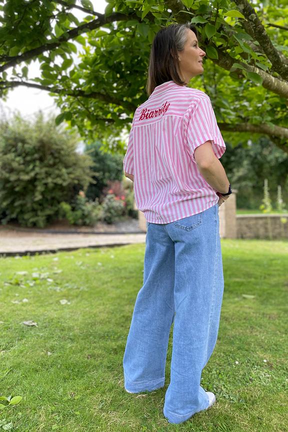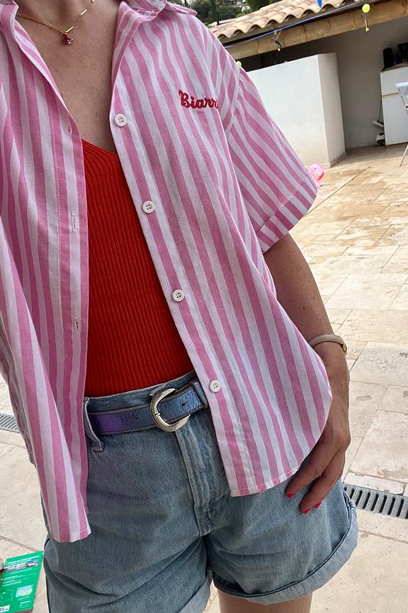 Pair this striped shirt with white jeans and sandals for a chic and casual summer look in Biarritz. • Short sleeve shirt • Loose straight cut • Classic collar • Vertical stripes • "Biarritz" embroidery