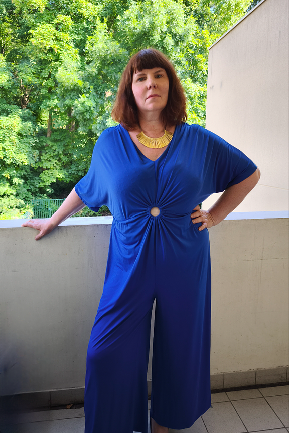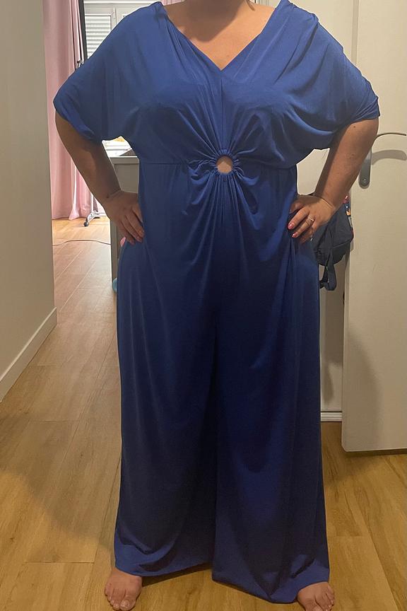 Pair this elegant jumpsuit with gold sandals and a minimalist clutch. Ideal for shining at a summer evening! • Jumpsuit with wide legs • Palazzo type legs • V-neck with cut-out ring • Wide short sleeves • Sparkling material