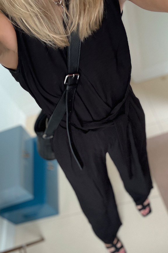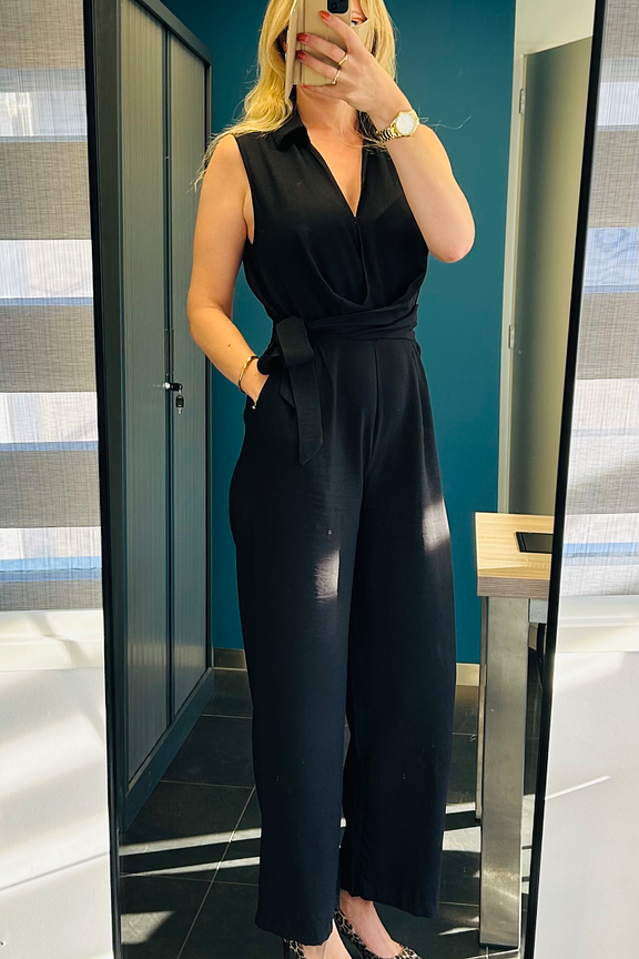 Go for colorful heels and a metallic clutch for a chic summer look. • Shirt collar jumpsuit • Crossed neckline • Sleeveless • Wide pants • Integrated belt