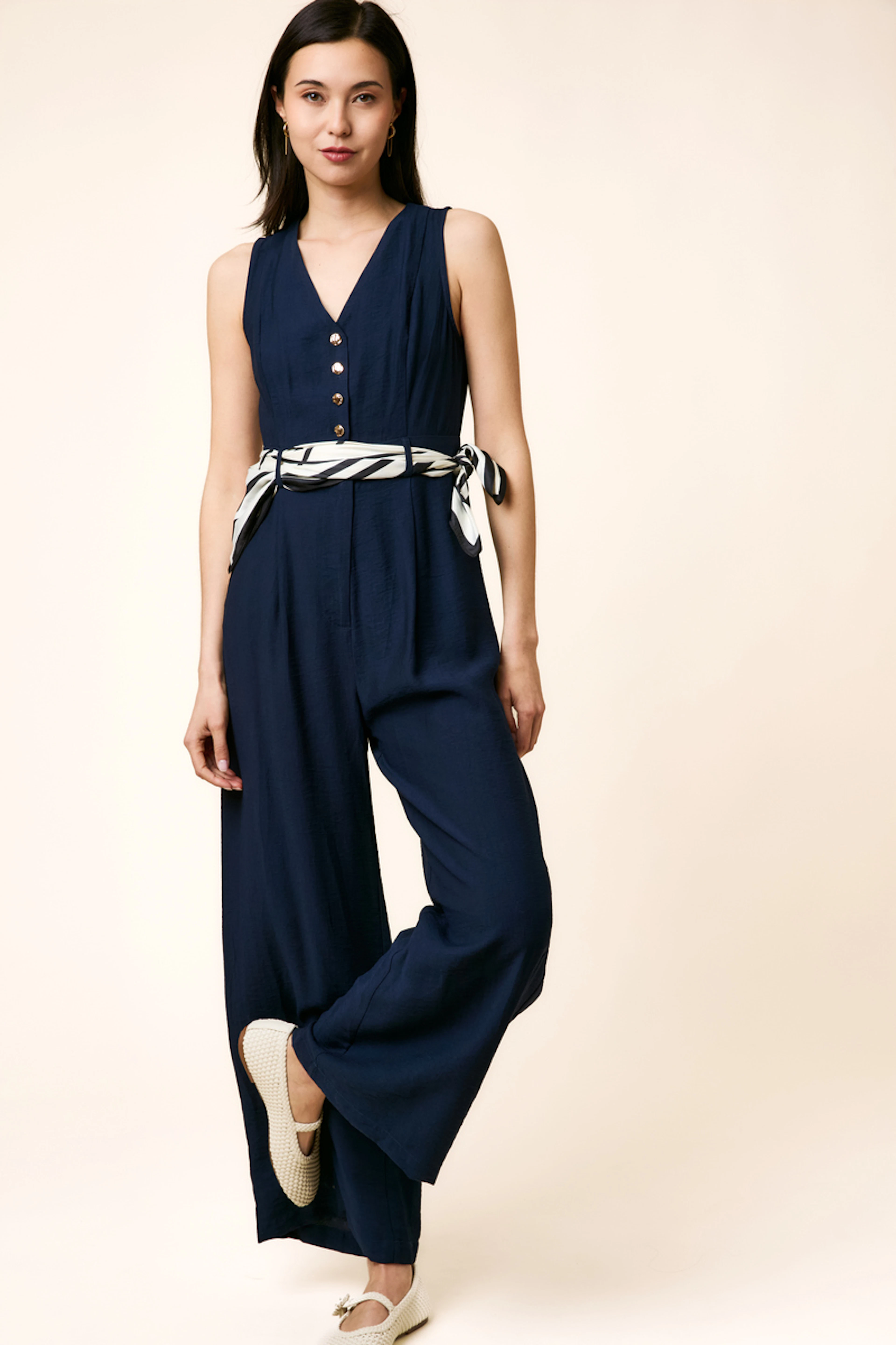 Pair this gorgeous blue jumpsuit with minimalist sandals and an oversized hat for a chic summer look. • Flowing jumpsuit • V-neckline • Cinched waist • Wide legs • Decorative buttons