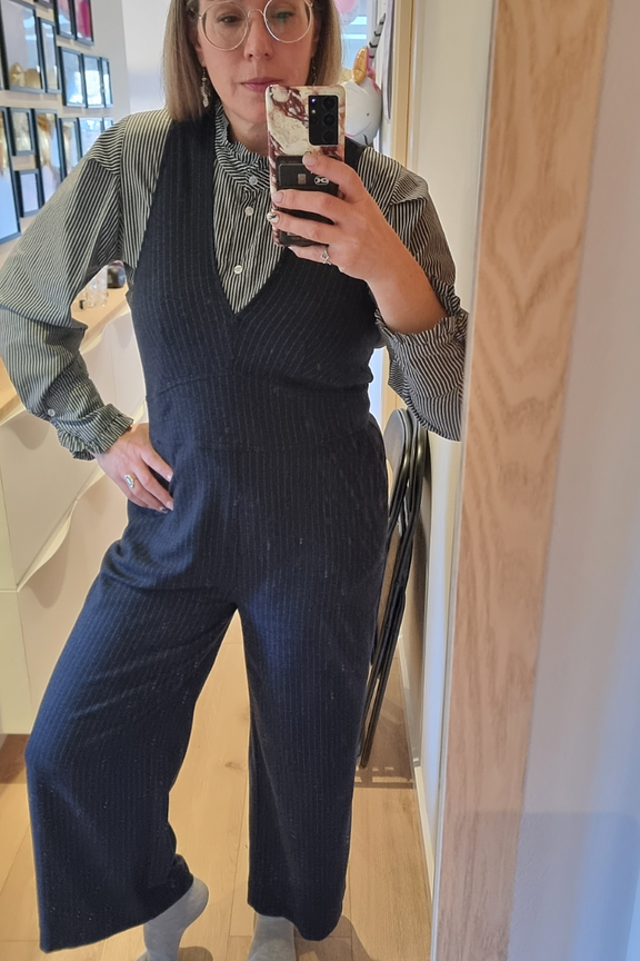 Pair this jumpsuit with a cream turtleneck and sneakers for a chic yet relaxed style, perfect for any season. • Striped jumpsuit • Fitted waist • V-neck • Wide legs • Integrated pockets