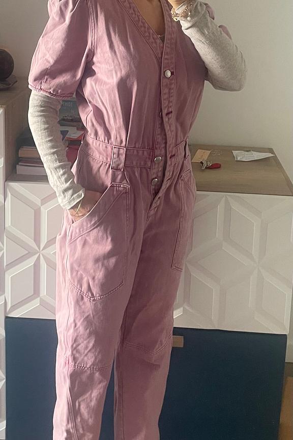 Pair this pink jumpsuit with golden sandals for a touch of sparkle this summer. • Cotton jumpsuit • Puffed sleeves • Fitted waist • Snap buttons • Bright pink color