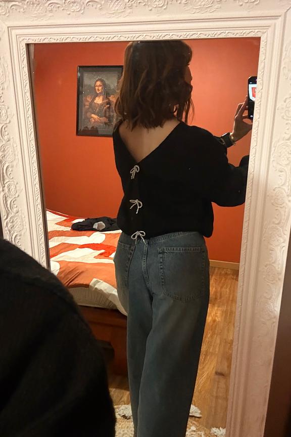 Pair it with high-waisted jeans and boots for a chic and casual look, perfect for winter. • Long sleeve vest • Flattering V-neck • Cozy voluminous sleeves • Elegant knot details • Comfortable regular fit