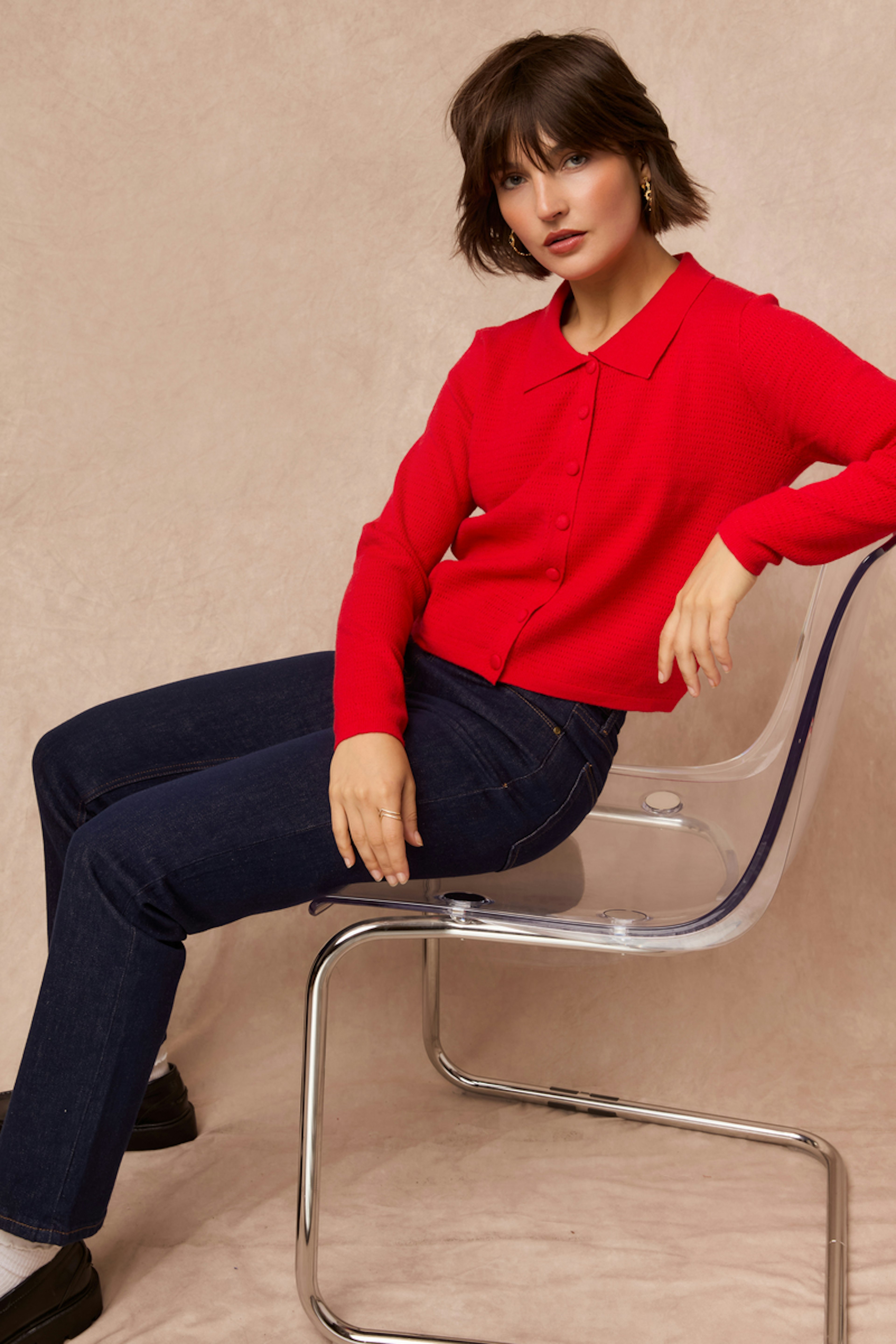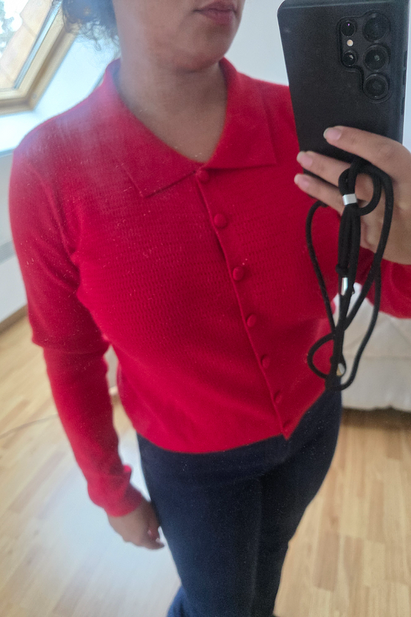 For a warm and stylish look this winter, pair this red vest with black pants and leather ankle boots. Add some gold earrings for a touch of glam. • Wool-blend vest • Classic shirt collar • Matching covered buttons • Long sleeves • Sophisticated openwork texture