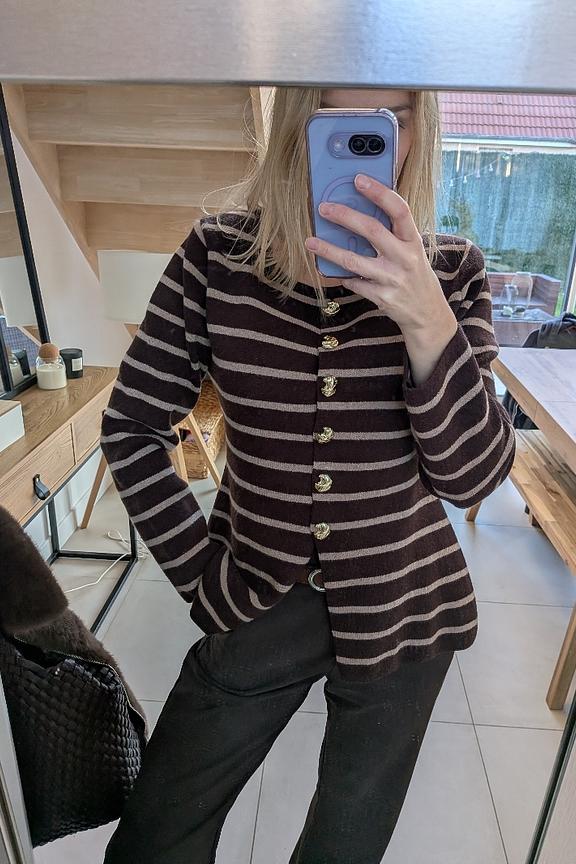 Wear it over a cream turtleneck with fitted pants for a chic winter vibe. • Vest • Front button closure • Long sleeves • Horizontal stripes • Gold buttons