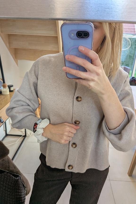 Wear this vest with wool pants for a chic and cozy look this winter. • Straight-cut vest • Long sleeves • Round collar • Button-up closure • Warm beige color