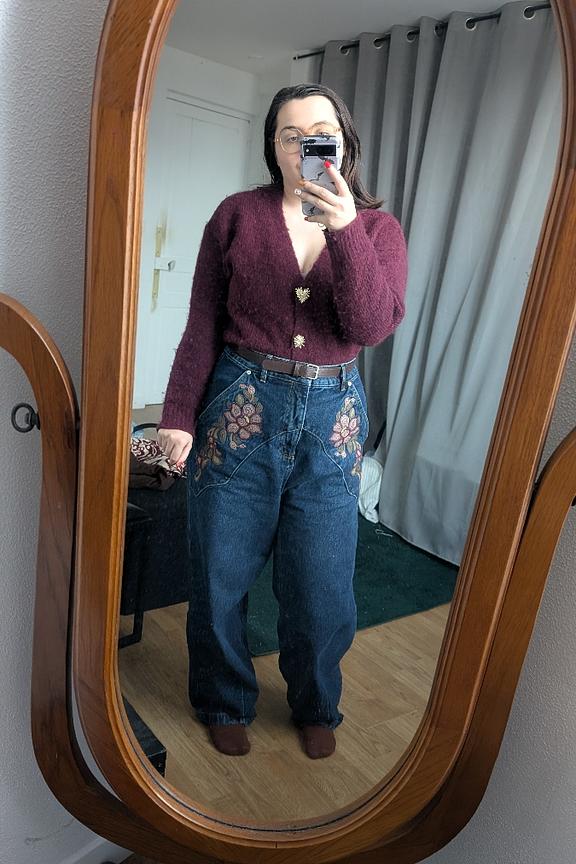Pair this purple vest with skinny jeans and ankle boots for a cozy and chic look, perfect for warming up those winter days with style. • Wool vest • V-neck • Loose fit • Long sleeves • Decorative brooches