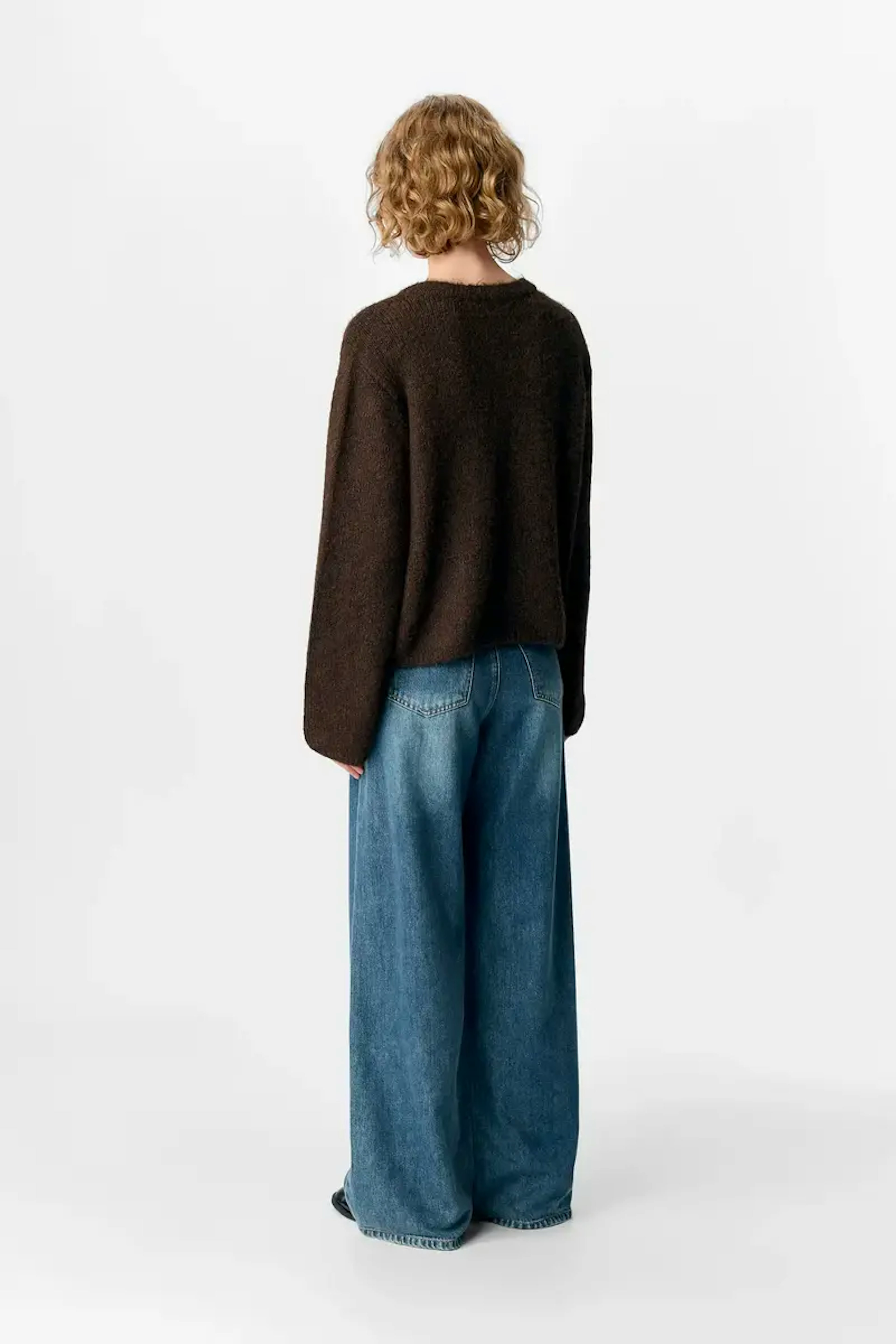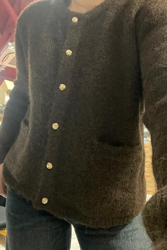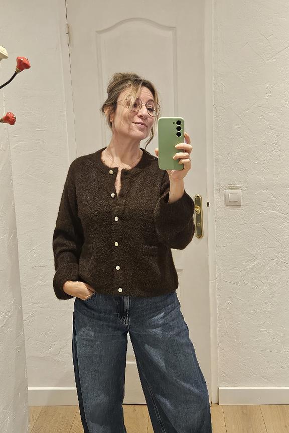 “Soft and fluffy cardigan in a beautiful chocolate color, complemented by the golden buttons. A bit oversized, choose the size below if you want it more fitted. I didn't like the "trendy" sleeves that are very long and wide at the wrist. Really impractical, impossible to roll them up, and difficult to wear the cardigan under a jacket even with generous sleeves without having bulky arms. I can't wait for the end of this trend and the return of tighter or more fitted cuffs.”