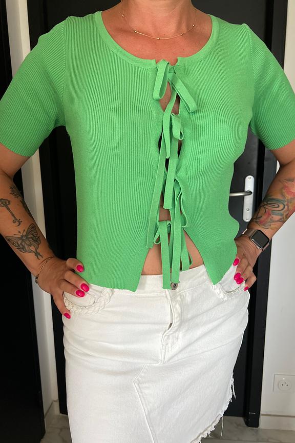 Brighten your summer with this Kilky green top, perfect for lounging in the sun on the terrace. Pair it with white jeans for a fresh and light look! • Lightweight viscose mesh top • Front lace-up detail • Flared short sleeves