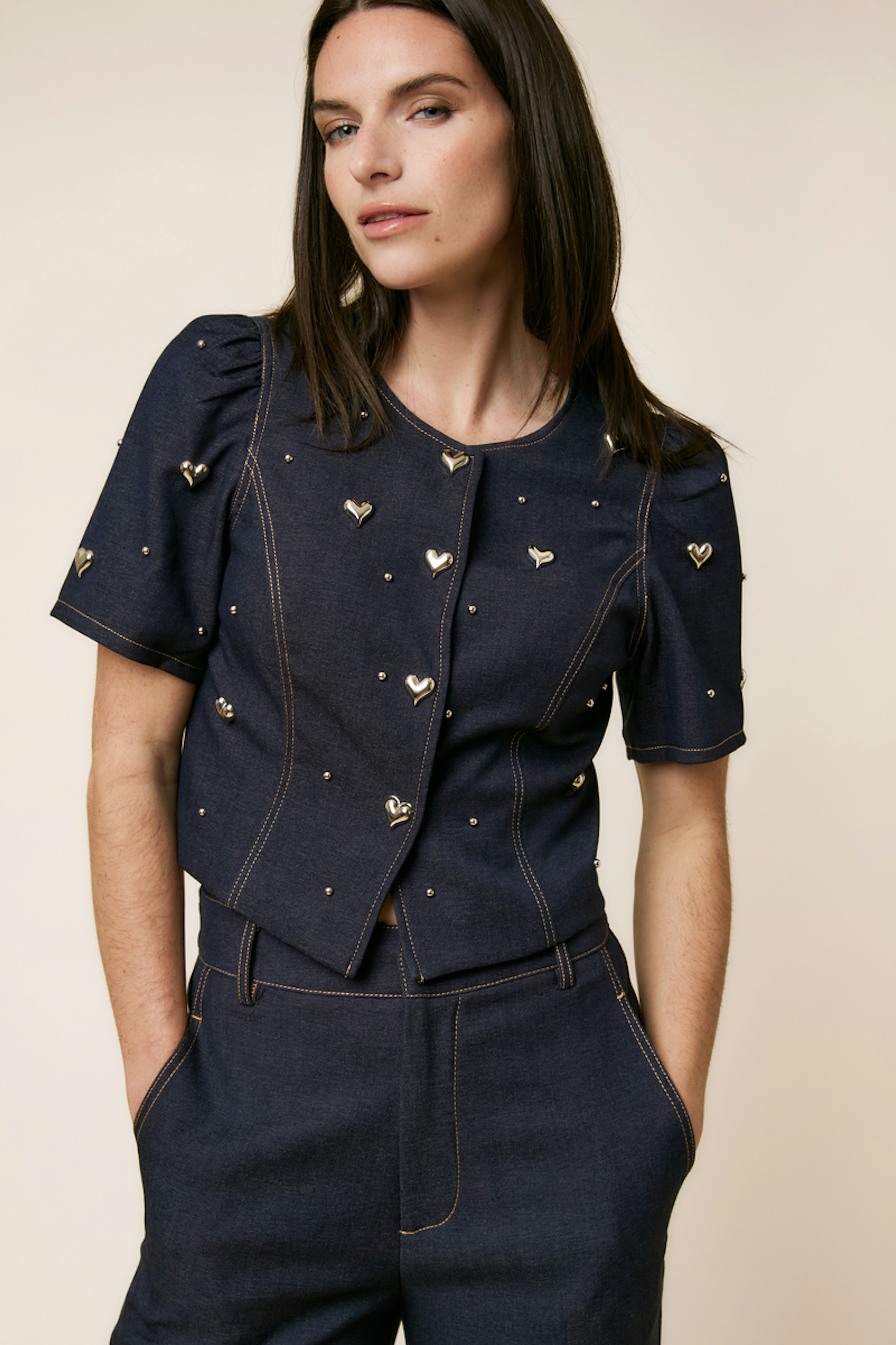 Add a bold touch of elegance to your outfit by combining this top with high-waisted pants and leather ankle boots. • Cropped top • Short sleeves • Round neckline • Heart pattern • Contrast stitching
