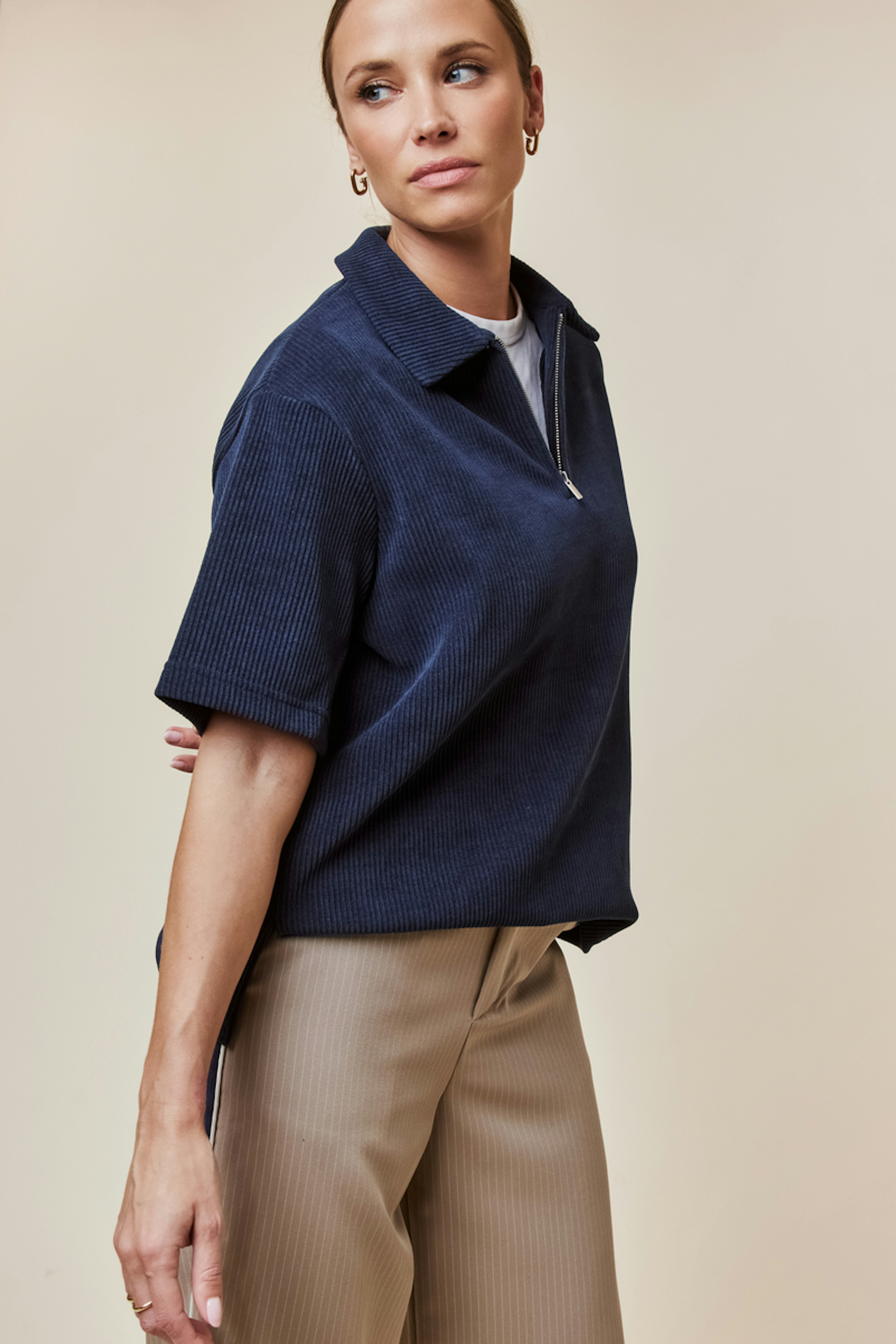 Match it with white pants and sneakers for a chic and laid-back style. Perfect for any season. • Corduroy top • Short sleeves • Half-zip closure • Shirt collar • Ribbed texture