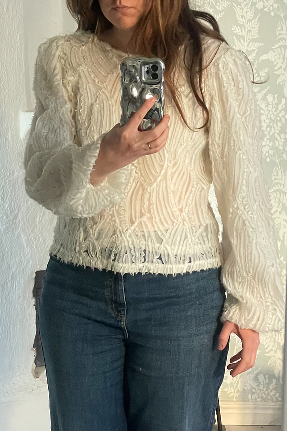 Style this textured top with high-waisted pants and heels for a sophisticated look for any occasion. • Long sleeve top • Loose fit for ultimate comfort • Unique raised texture • Classic round neckline • Delicate sheer details