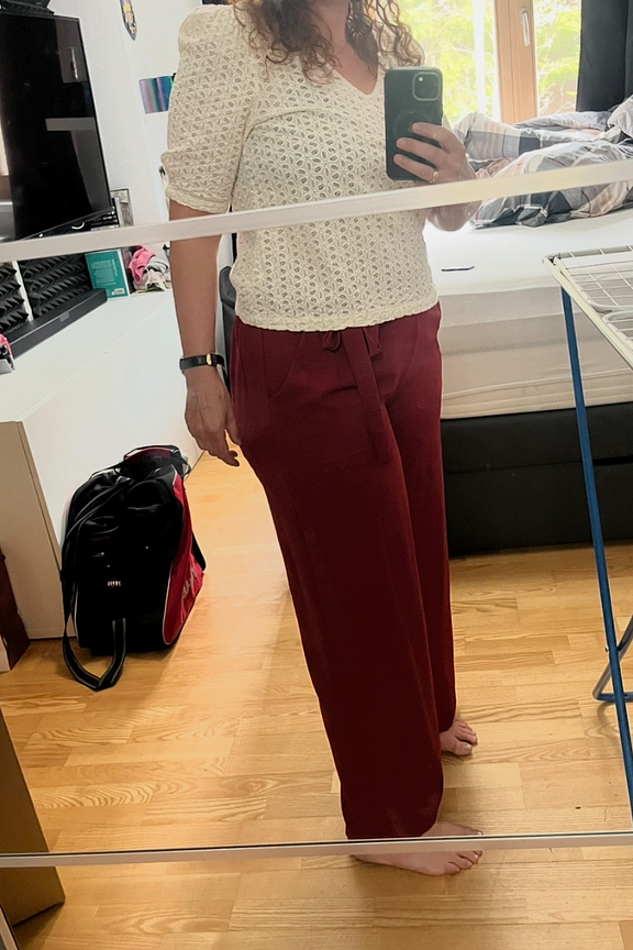 Wear this top with white jeans and golden sandals for the perfect summer look. Ideal for a chic and casual appearance. • Cotton top • V-neck • Puffed short sleeves • Lattice pattern • Slightly transparent