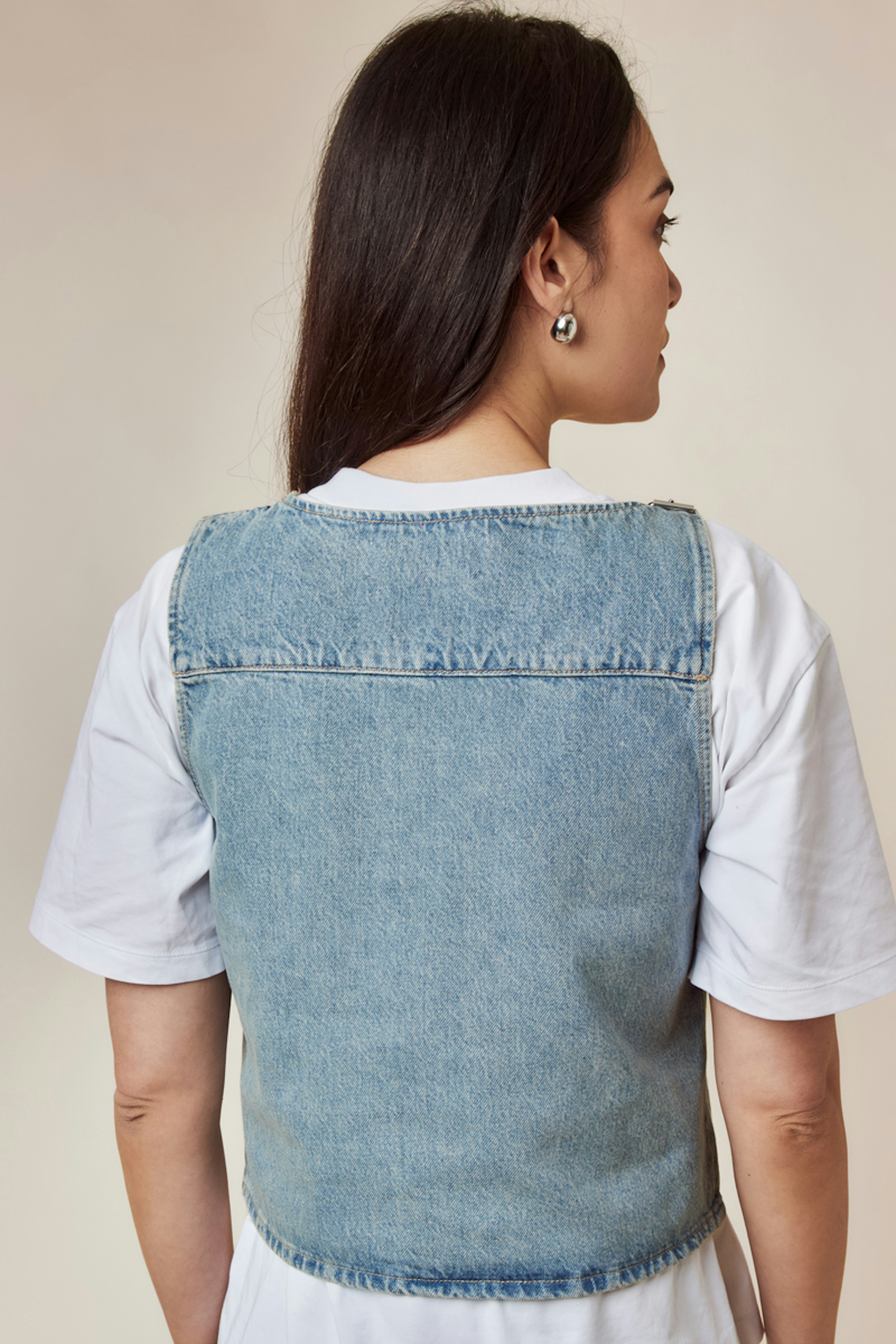 Style this top with white jeans and heeled sandals for a chic, laid-back summer look. • Denim top • Straight cut • Adjustable straps • Round neckline • Light blue denim
