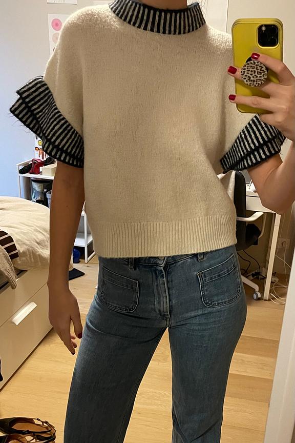 Style this top with some black leather pants and ankle boots for a chic winter look. • Wool sweater • Short sleeves • Round neck • Striped details • Loose fit