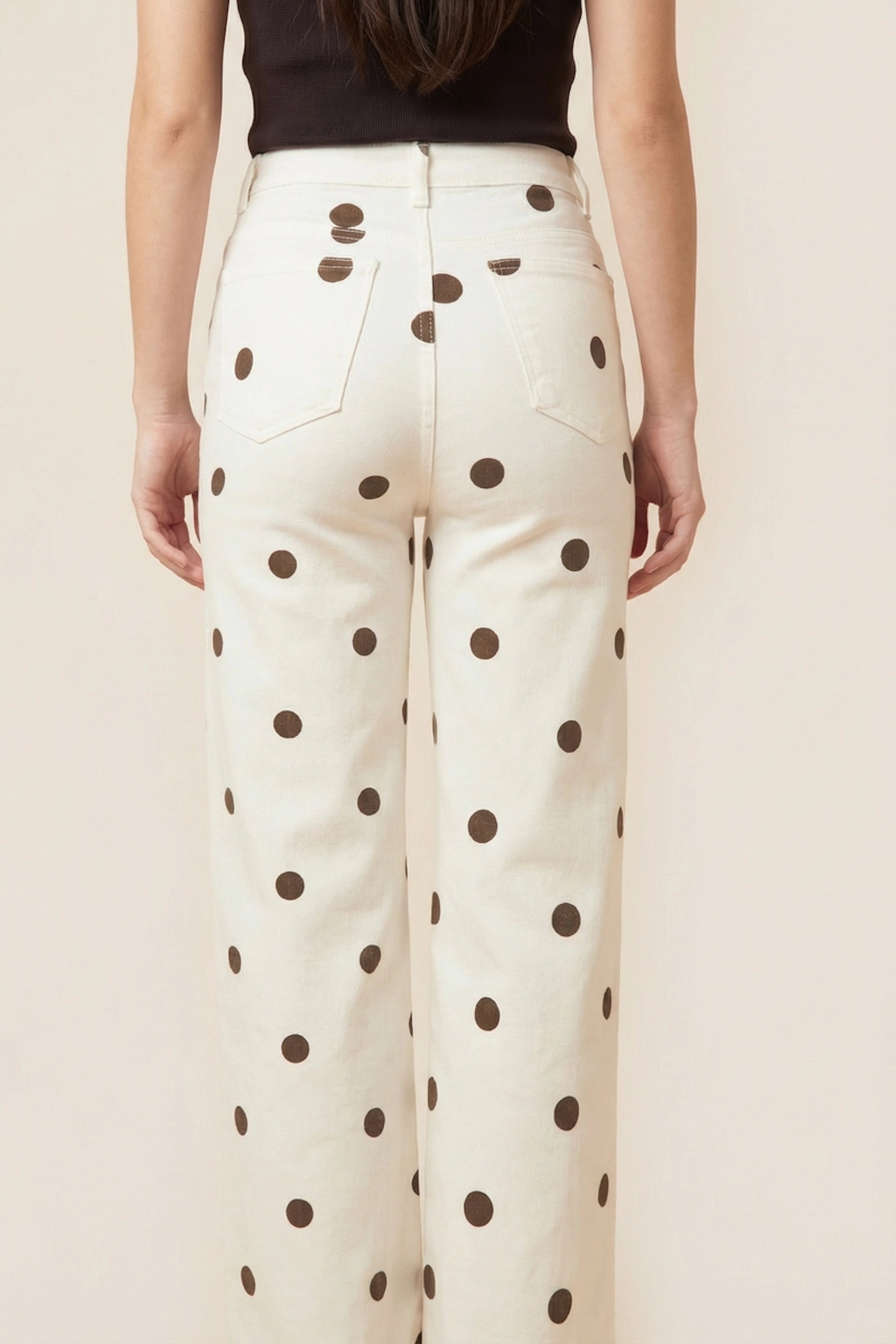 Pair this polka dot jeans with a solid top and some gold sandals for a chic summer look. • Straight jeans • High waist • Ankle length • Polka dot print • Zip and button closure