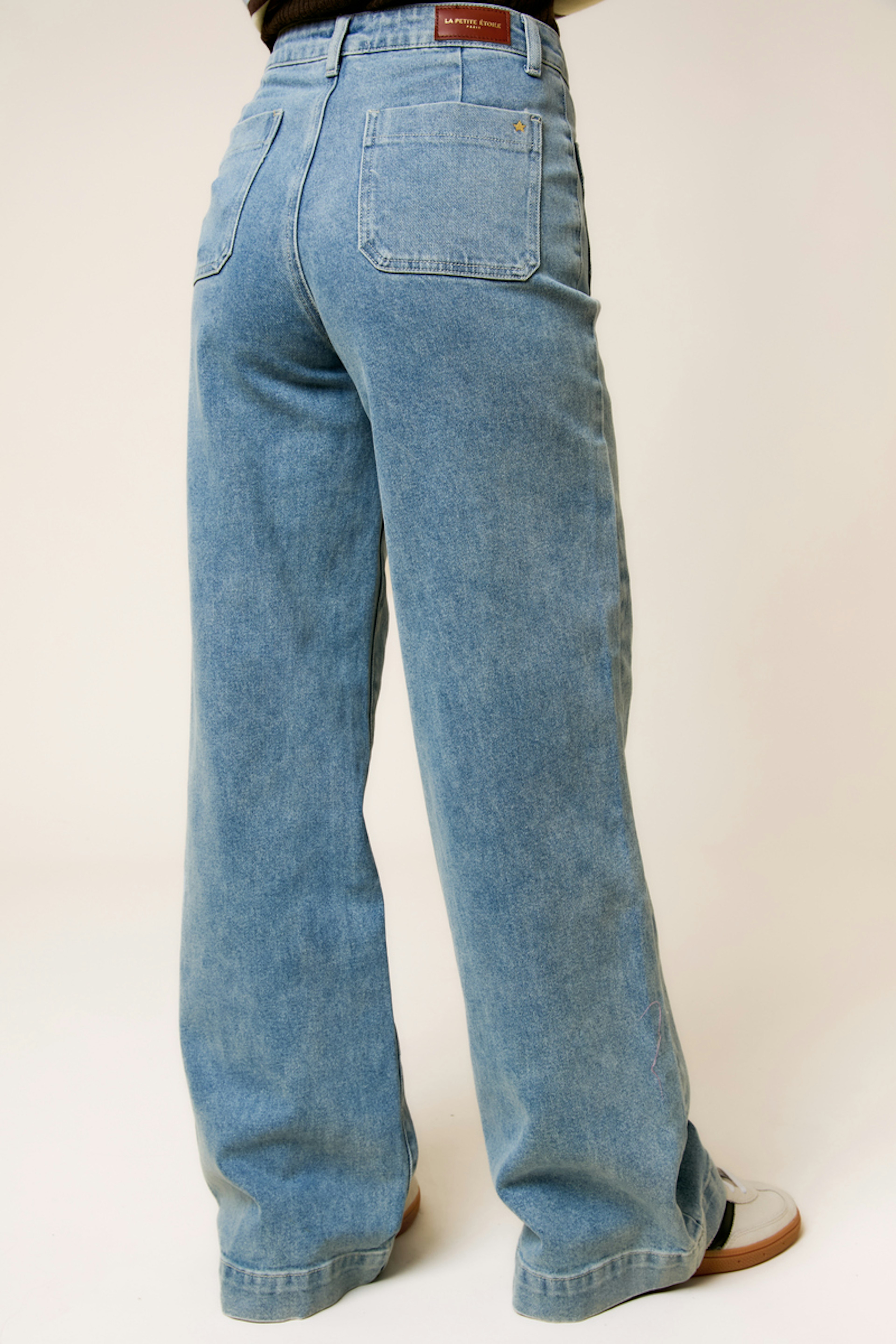 Pair these jeans with a graphic tee and sneakers for a casual and modern look. Perfect for any season. • Wide-leg • Flattering high waist • Generous length • Button closure • Bright light blue wash