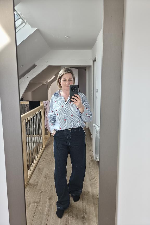For a chic and relaxed look, pair these jeans with a linen shirt and leather loafers. Add a leather bag for a sophisticated touch. • Wide cut jeans • High waist • Loose legs • Rolled hem • Deep blue
