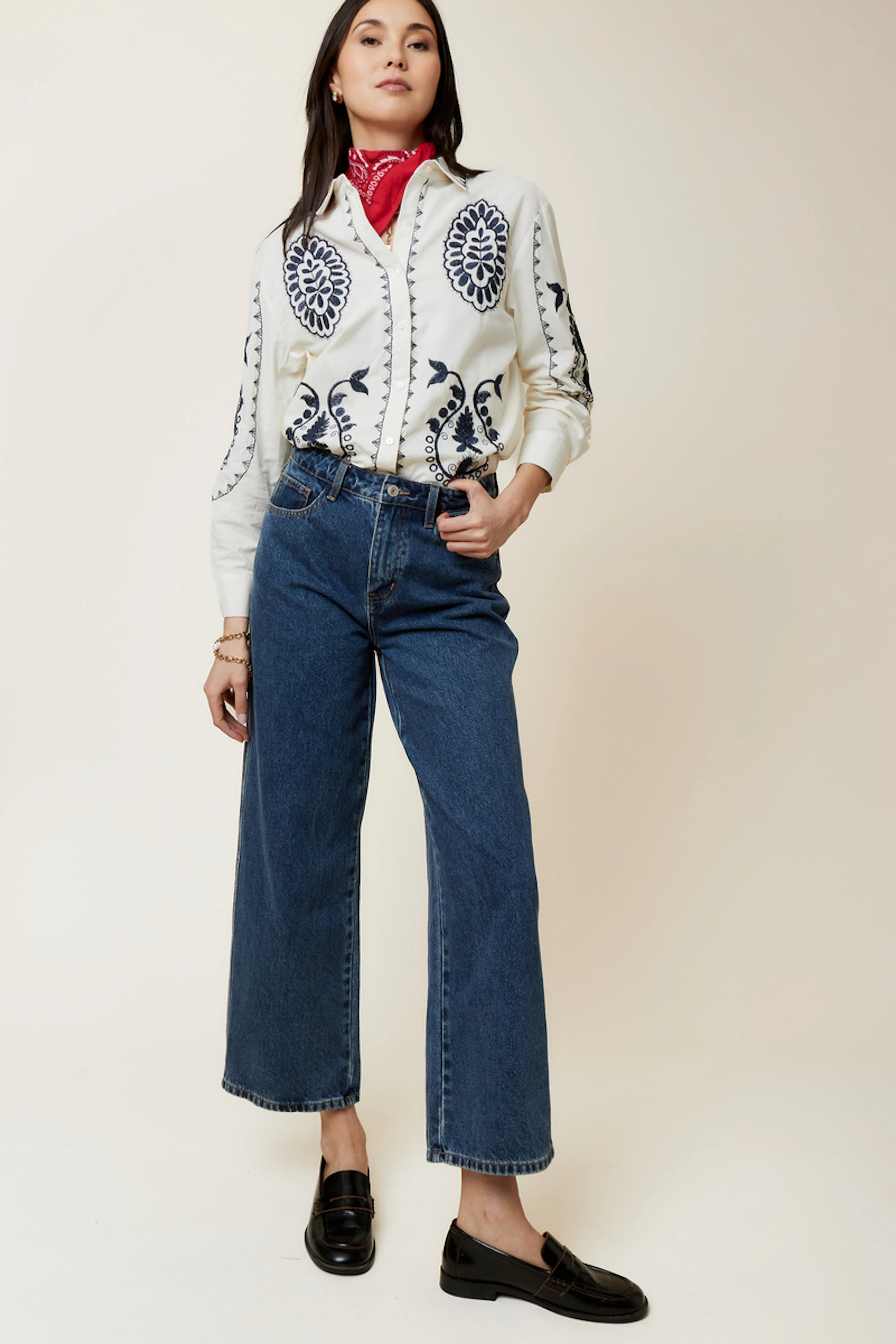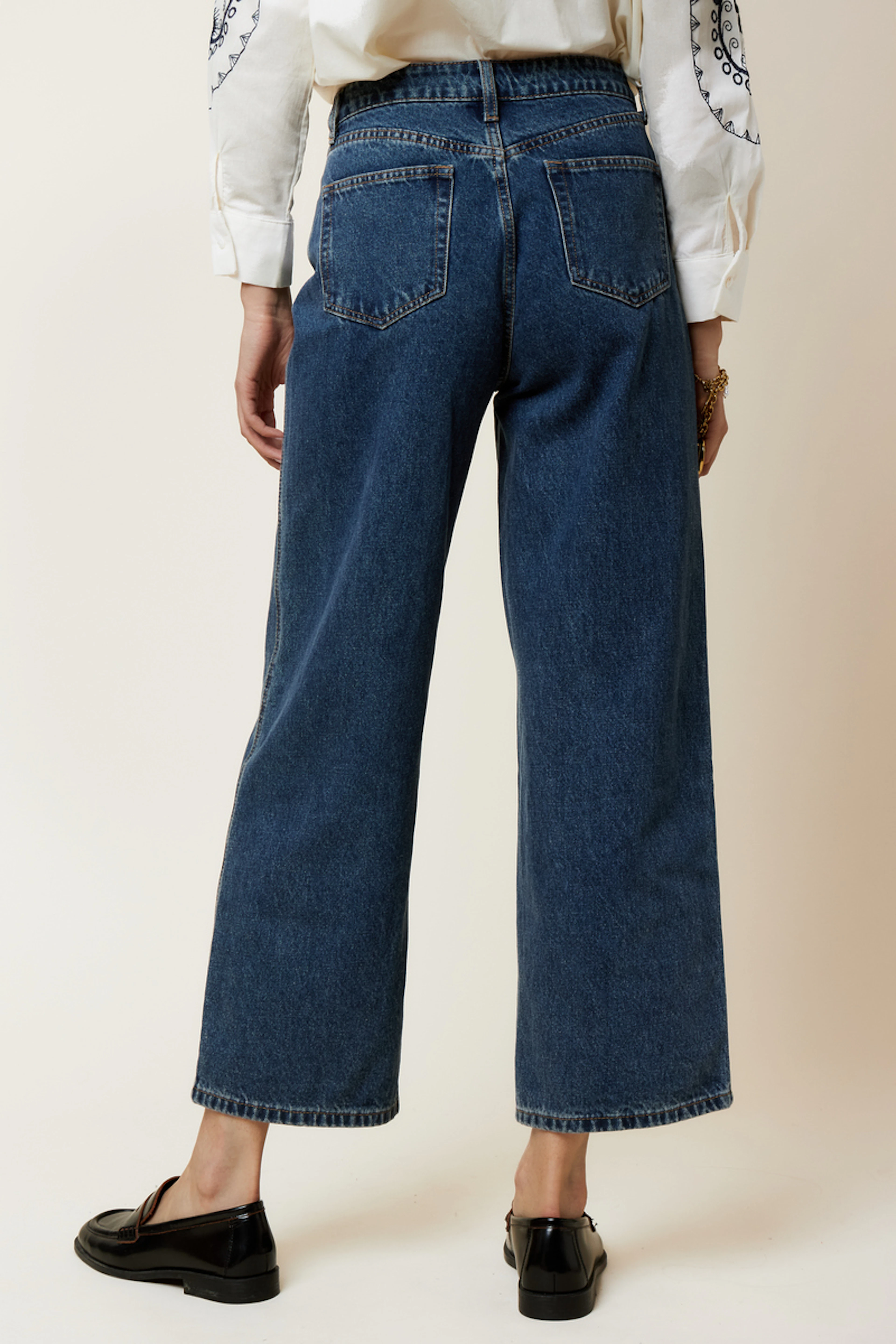 Create a chic yet laid-back look by pairing these jeans with a lightweight shirt and some loafers. Add a colorful scarf for a stylish touch. • Straight-cut jeans • Mid-rise • Ankle length • Clean hem detail • Classic blue color
