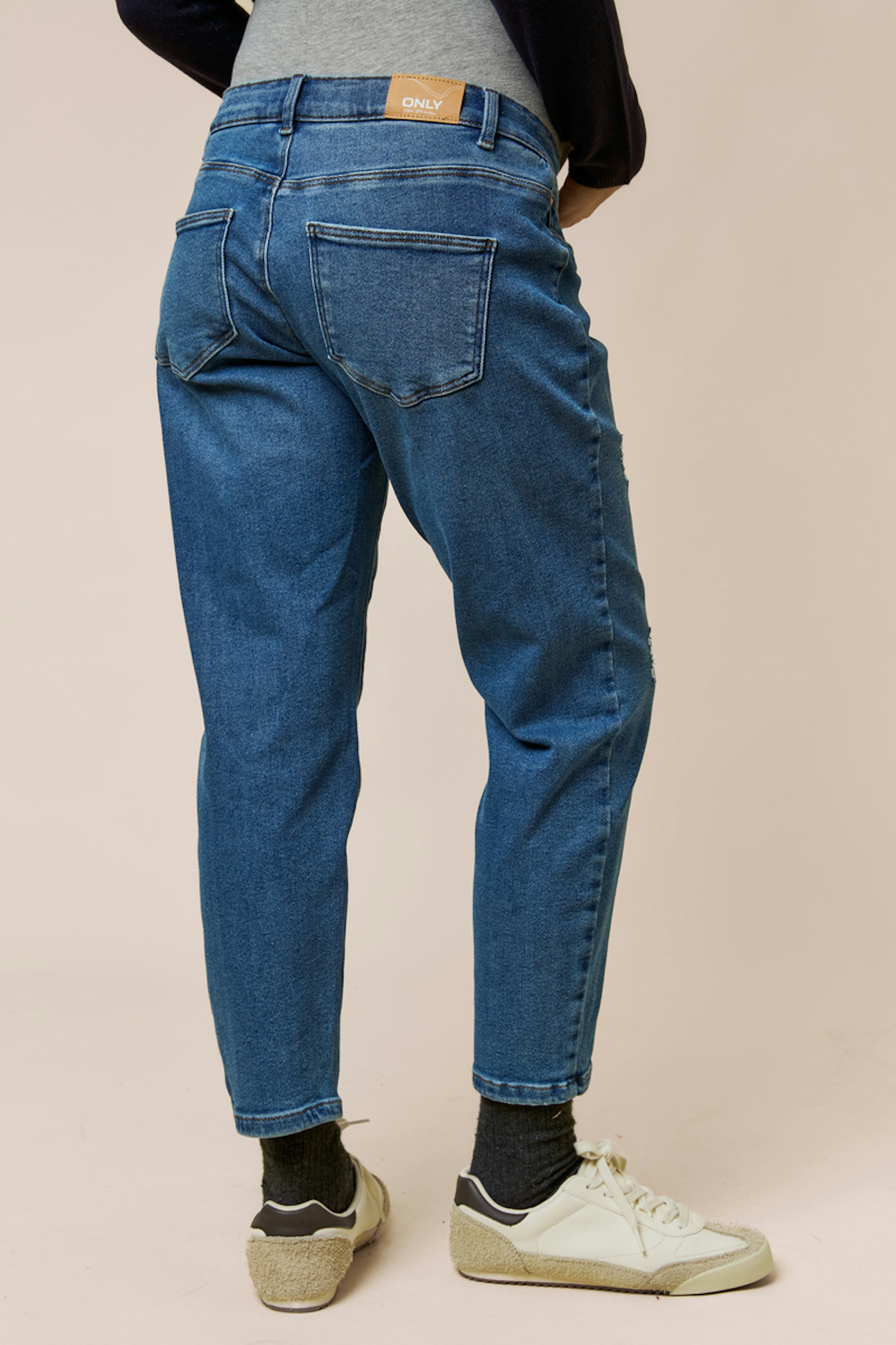 Pair these jeans with a flowy top and sandals for a chic, relaxed vibe. • Straight-cut jeans • Fitted waist • Ankle length • Distressed details • Elastane for comfort