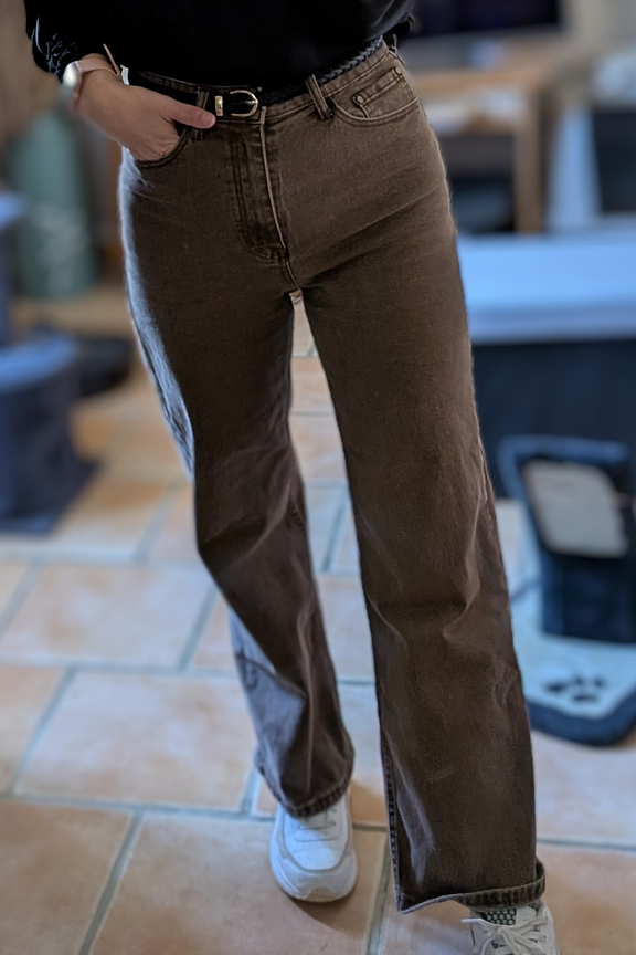 Opt for a chic casual look by pairing these wide-leg jeans with a cozy pull and elegant ankle boots. Perfect for a relaxed yet sophisticated silhouette. • Wide-leg jeans • Flattering high waist • Loose, flowy legs • Versatile brown color • Perfect for any season