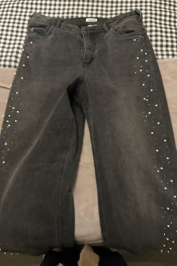 Pair these jeans with a colorful oversized pull for a comfy yet stylish day. • Straight cut jeans • High waist • Stud detail on the side • Standard length • Elegant grey
