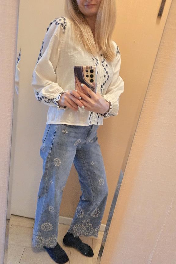 Pair this jean with a flowy blouse and loafers for a bohemian chic look, perfect for any season. • Flare Jean • Flattering high waist • Delicate embroidered patterns • Scalloped hem • Timeless light blue