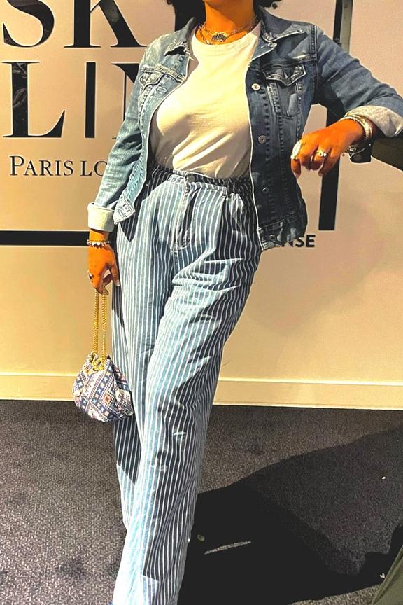 Pair these jeans with a light top and sandals for a laid-back summer look. • Wide leg jeans • Flattering high waist • Spacious front pockets • Striped pattern • Buttoned closure