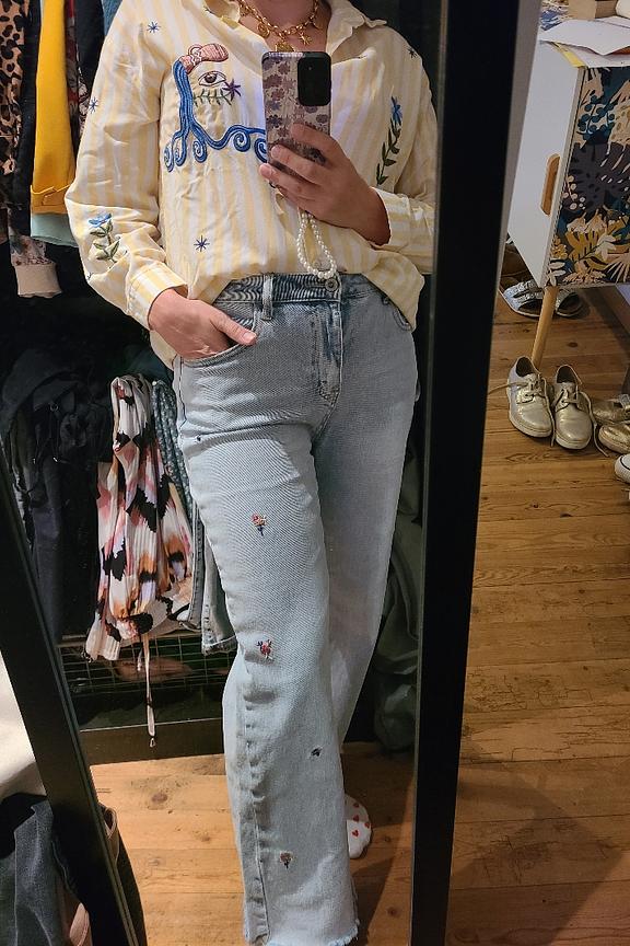 “Good cut, elegant embroidery that gives it a bit of originality. Like all cotton jeans, it stretches: size 34 fits me barely a bit loose after half a day of wear. Rather for mid-season or summer since it is very faded.”