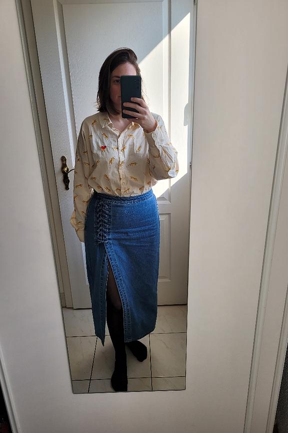 Add a bohemian touch with a flowy blouse and heeled boots. Perfect for any season. • Denim skirt • Pencil cut • Front slit • Laced detail • Mid-calf length