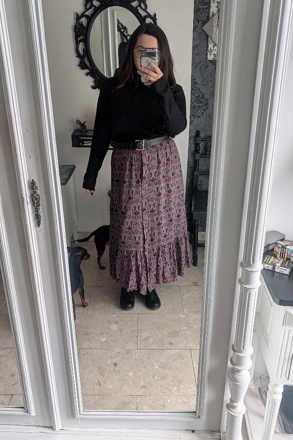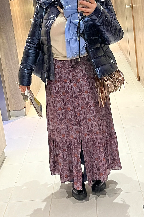 Pair this skirt with a cozy turtleneck sweater and knee-high boots for a chic winter look. • Long patterned skirt • Loose and fluid fit • Comfortable elasticated waist • Elegant ruffles • Sophisticated printed motif