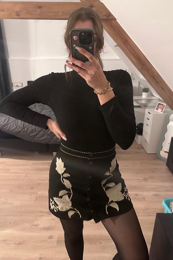 Add a touch of Parisian charm to your wardrobe with this black skirt adorned with a delicate pattern. Wear it with a white blouse and ankle boots for a chic and refined look, perfect for winter. • Short skirt • Decorative buttons on the front • Floral embroidery • Fitted high waist • Slightly flared hem